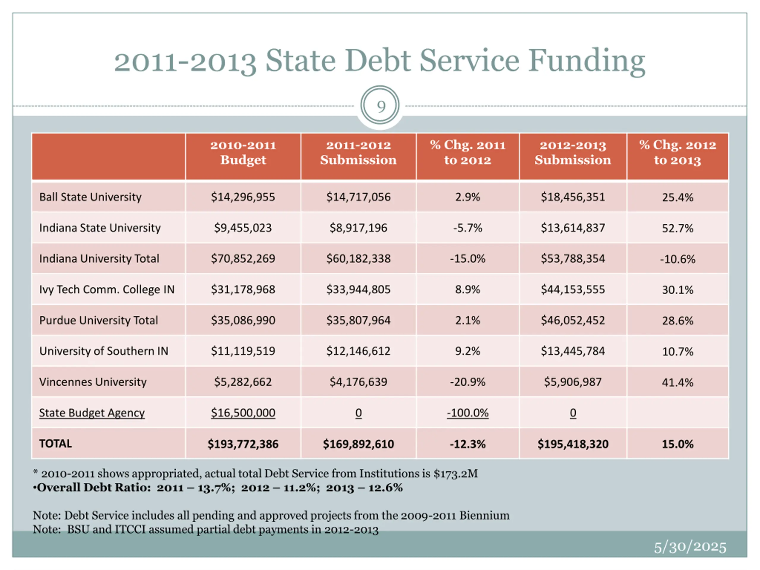 2011-2013 State Debt Service Funding 9 2010-2011 Budget 2011-2012 Submission % Chg. 2011 to 2012 2012-2013 Submission % Chg. 2012 to 2013 Ball State University $14,296,955 $14,717,056 2.9% $18,456,351 25.4% Indiana State University $9,455,023 $8,917,196 -5.7% $13,614,837 52.7% Indiana University Total $70,852,269 $60,182,338 -15.0% $53,788,354 -10.6% Ivy Tech Comm. College IN $31,178,968 $33,944,805 8.9% $44,153,555 30.1% Purdue University Total $35,086,990 $35,807,964 2.1% $46,052,452 28.6% University of Southern IN $11,119,519 $12,146,612 9.2% $13,445,784 10.7% Vincennes University $5,282,662 $4,176,639 -20.9% $5,906,987 41.4% State Budget Agency $16,500,000 0 -100.0% 0 TOTAL $193,772,386 $169,892,610 -12.3% $195,418,320 15.0% * 2010-2011 shows appropriated, actual total Debt Service from Institutions is $173.2M Overall Debt Ratio: 2011 13.7%; 2012 11.2%; 2013 12.6% Note: Debt Service includes all pending and approved projects from the 2009-2011 Biennium Note: BSU and ITCCI assumed partial debt payments in 2012-2013 5/30/2025