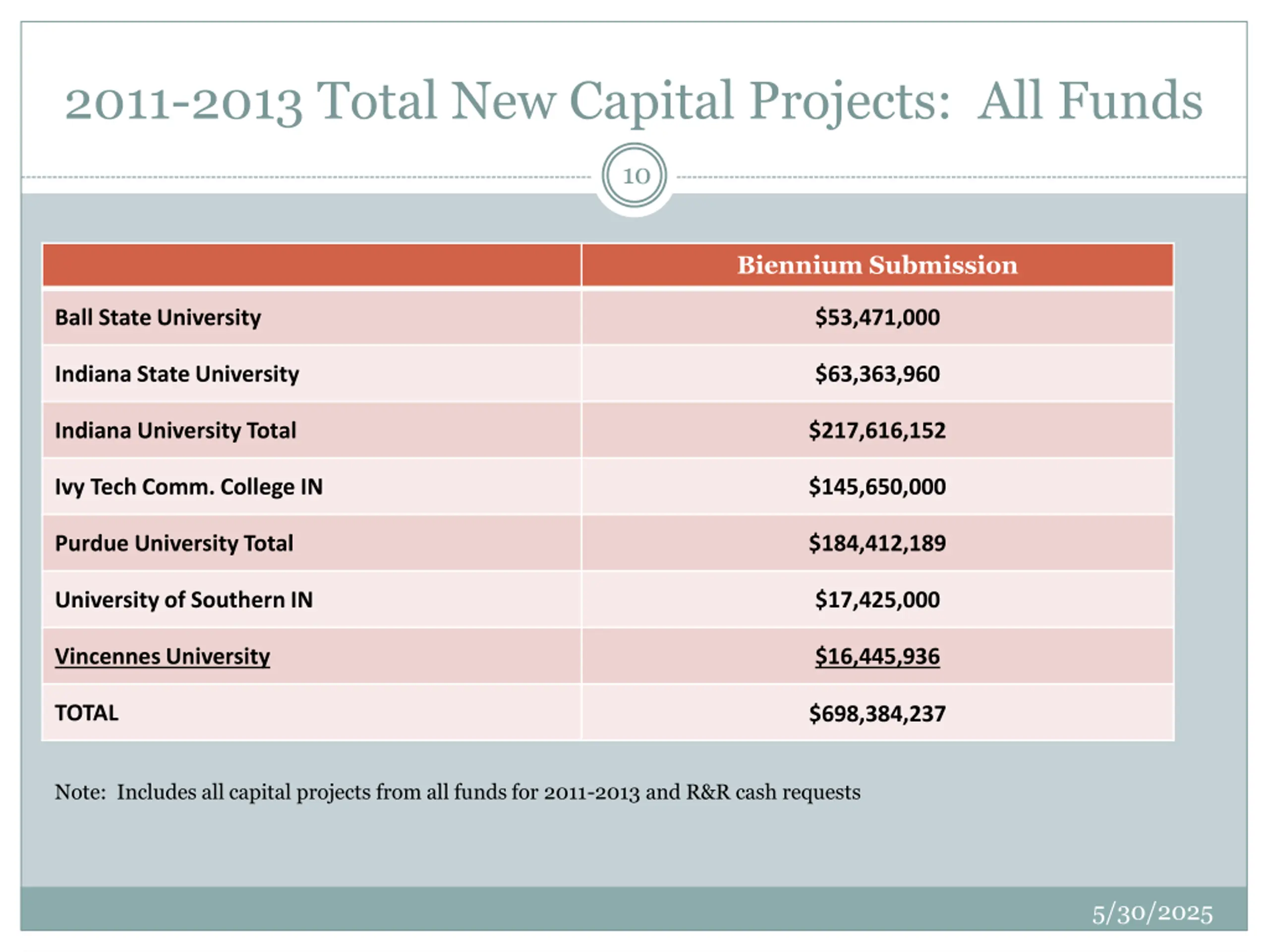 2011-2013 Total New Capital Projects: All Funds 10 Biennium Submission Ball State University $53,471,000 Indiana State University $63,363,960 Indiana University Total $217,616,152 Ivy Tech Comm. College IN $145,650,000 Purdue University Total $184,412,189 University of Southern IN $17,425,000 Vincennes University $16,445,936 TOTAL $698,384,237 Note: Includes all capital projects from all funds for 2011-2013 and R&R cash requests 5/30/2025
