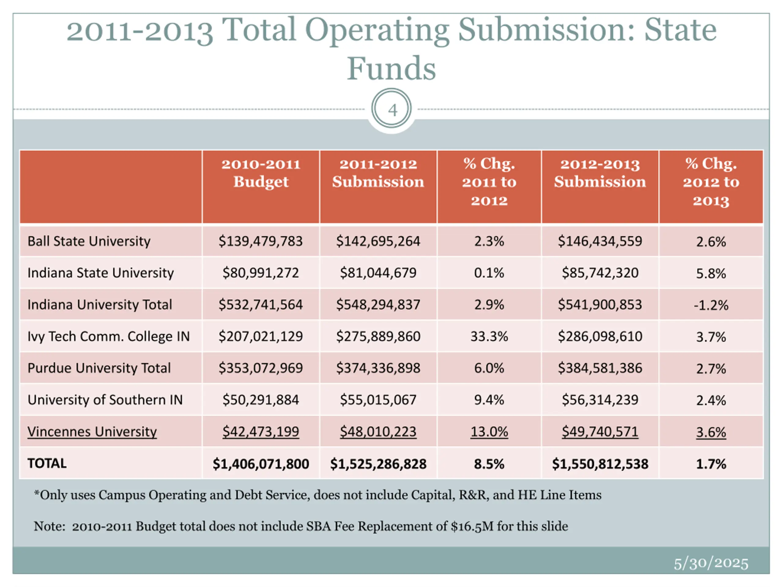 2011-2013 Total Operating Submission: State Funds 4 2010-2011 Budget 2011-2012 Submission % Chg. 2011 to 2012 2012-2013 Submission % Chg. 2012 to 2013 Ball State University $139,479,783 $142,695,264 2.3% $146,434,559 2.6% Indiana State University $80,991,272 $81,044,679 0.1% $85,742,320 5.8% Indiana University Total $532,741,564 $548,294,837 2.9% $541,900,853 -1.2% Ivy Tech Comm. College IN $207,021,129 $275,889,860 33.3% $286,098,610 3.7% Purdue University Total $353,072,969 $374,336,898 6.0% $384,581,386 2.7% University of Southern IN $50,291,884 $55,015,067 9.4% $56,314,239 2.4% Vincennes University $42,473,199 $48,010,223 13.0% $49,740,571 3.6% TOTAL $1,406,071,800 $1,525,286,828 8.5% $1,550,812,538 1.7% *Only uses Campus Operating and Debt Service, does not include Capital, R&R, and HE Line Items Note: 2010-2011 Budget total does not include SBA Fee Replacement of $16.5M for this slide 5/30/2025