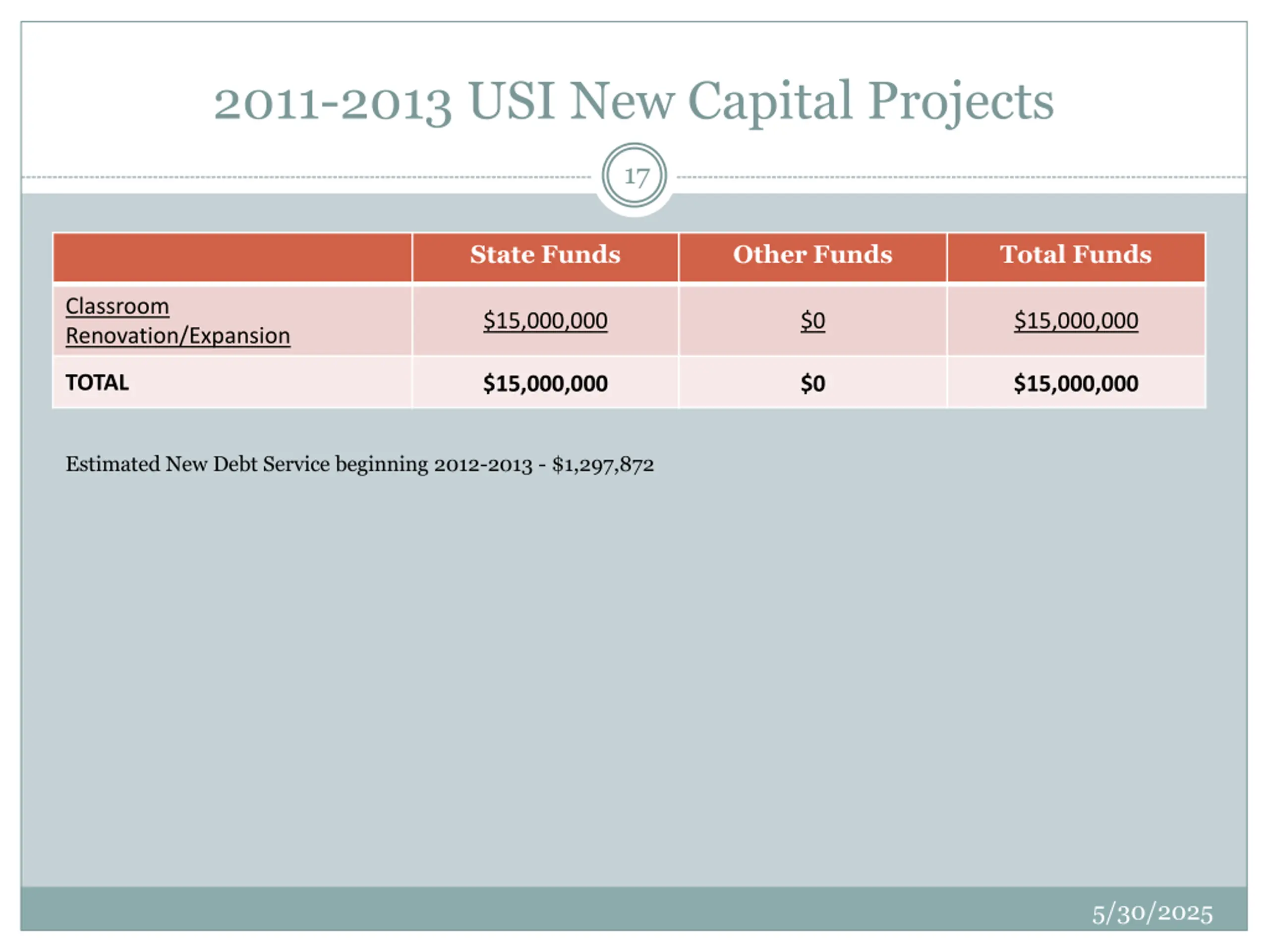 2011-2013 USI New Capital Projects 17 State Funds Other Funds Total Funds Classroom Renovation/Expansion $15,000,000 $0 $15,000,000 TOTAL $15,000,000 $0 $15,000,000 Estimated New Debt Service beginning 2012-2013 - $1,297,872 5/30/2025