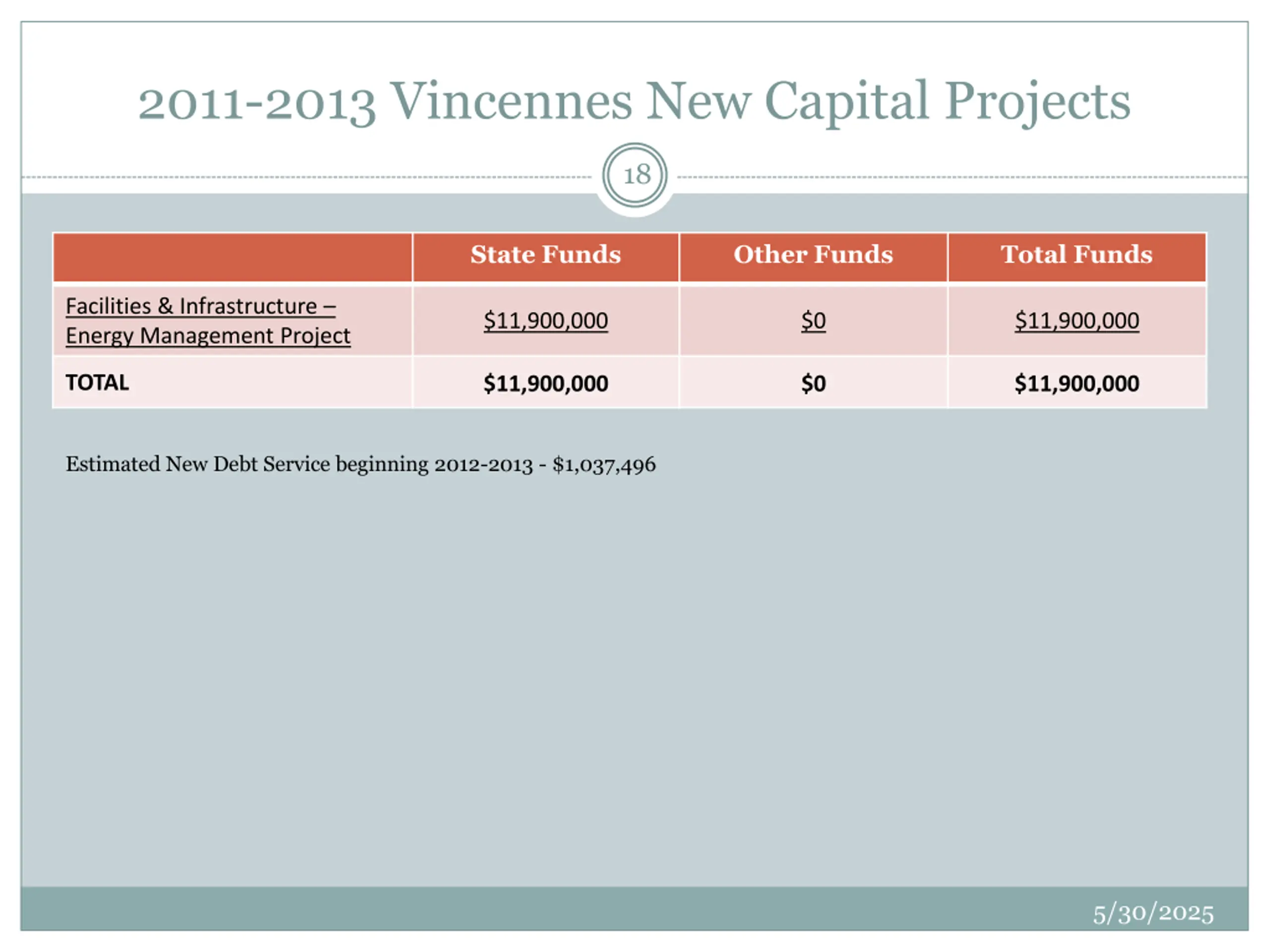 2011-2013 Vincennes New Capital Projects 18 State Funds Other Funds Total Funds Facilities & Infrastructure Energy Management Project $11,900,000 $0 $11,900,000 TOTAL $11,900,000 $0 $11,900,000 Estimated New Debt Service beginning 2012-2013 - $1,037,496 5/30/2025