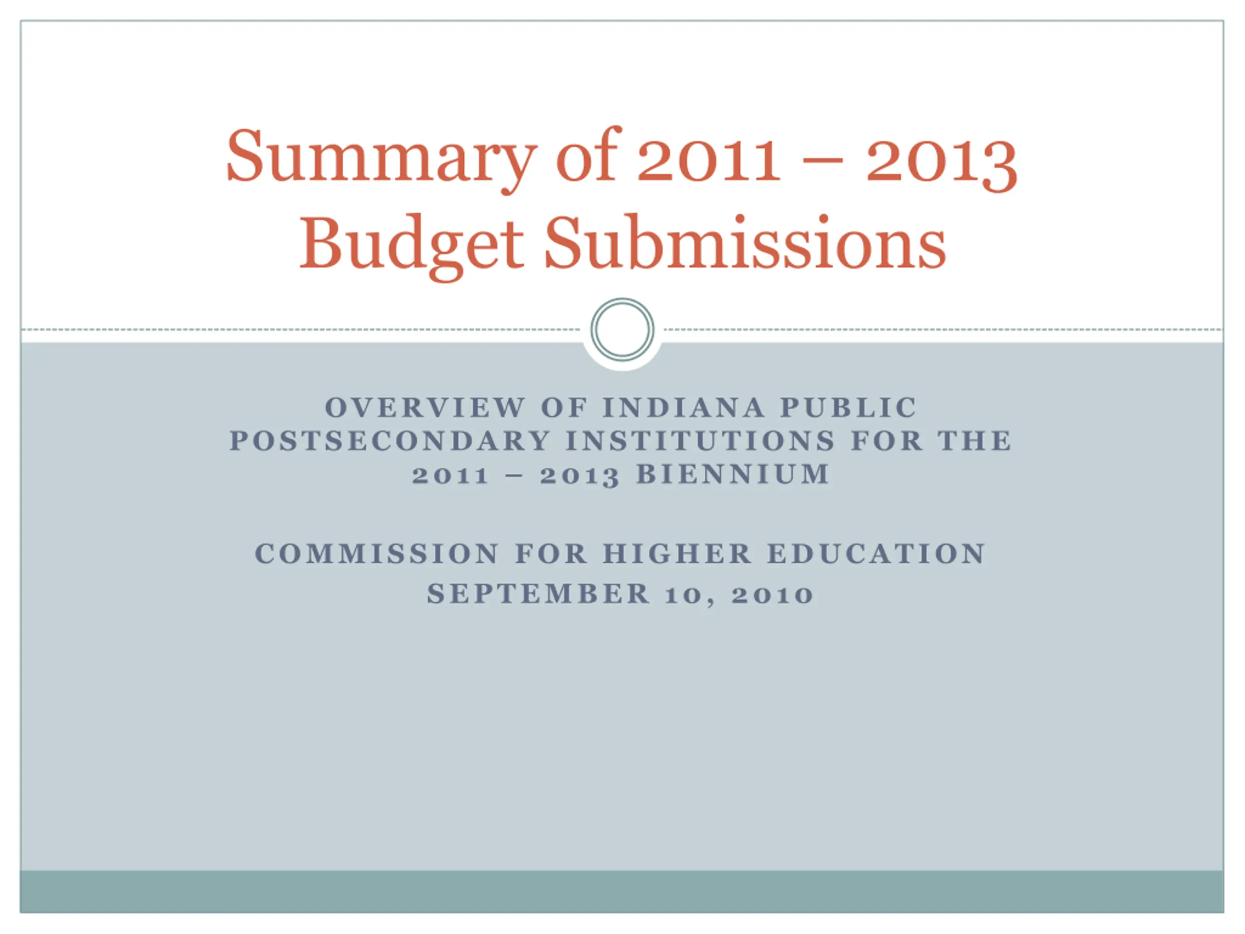 Summary of 2011 2013 Budget Submissions OVERVIEW OF INDIANA PUBLIC POSTSECONDARY INSTITUTIONS FOR THE 2011 2013 BIENNIUM COMMISSION FOR HIGHER EDUCATION SEPTEMBER 10, 2010