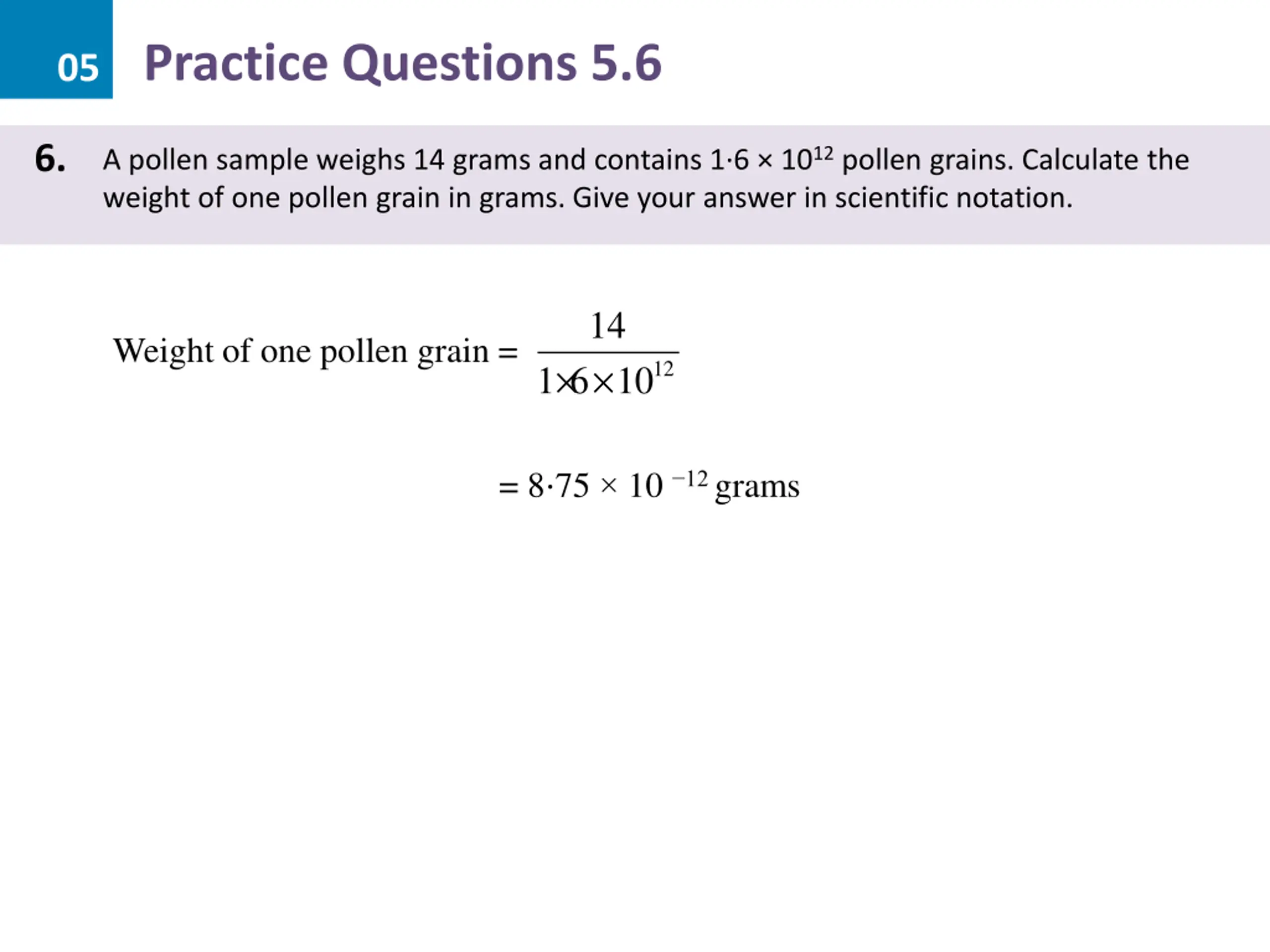 05 Practice Questions 5.6 6. A pollen sample weighs 14 grams and contains 1 6 1012 pollen grains. Calculate the weight of one pollen grain in grams. Give your answer in scientific notation. 14 Weight of one pollen grain = 1 6 1012 = 8 75 10 12 grams