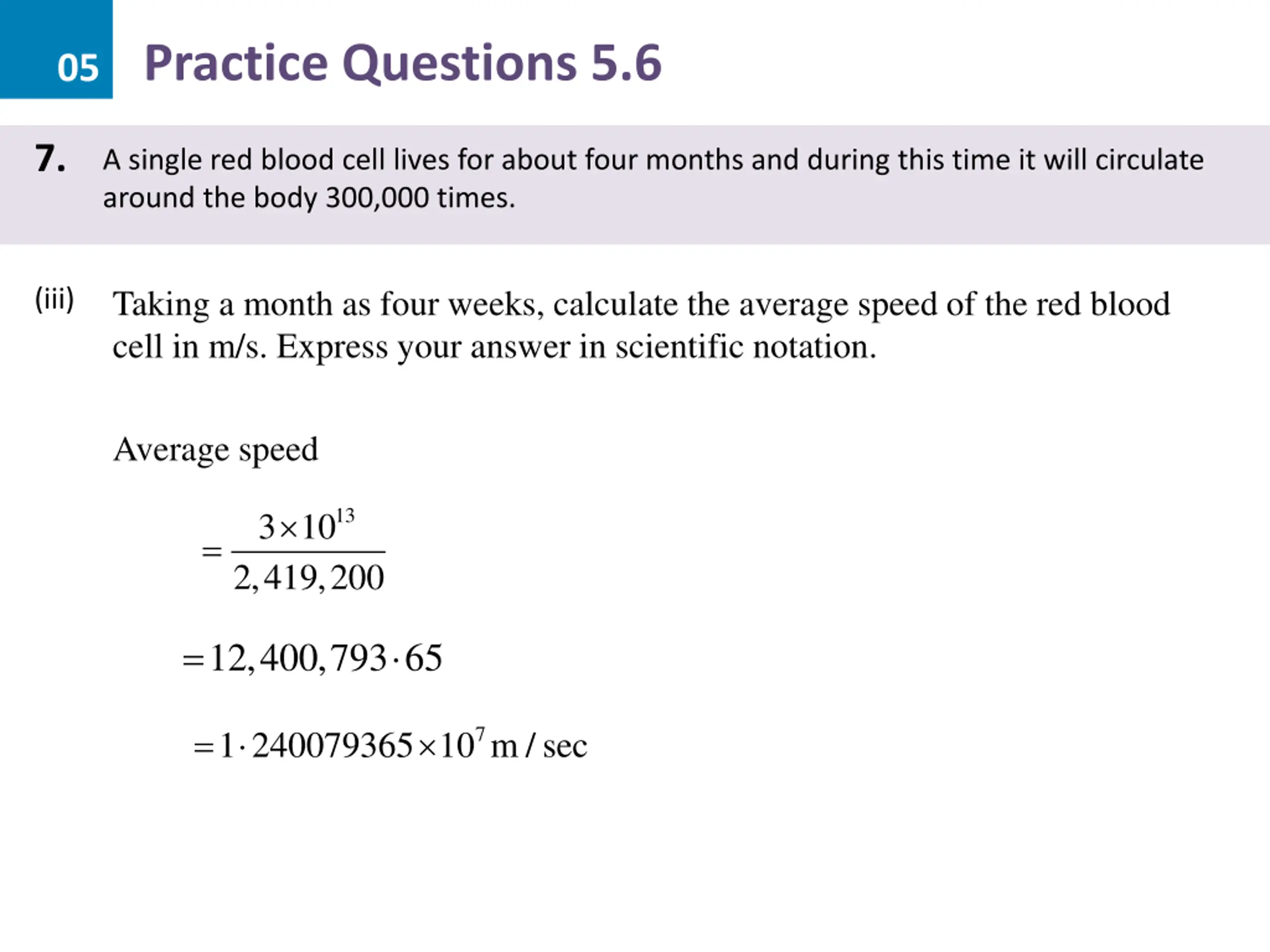 05 Practice Questions 5.6 7. A single red blood cell lives for about four months and during this time it will circulate around the body 300,000 times. Taking a month as four weeks, calculate the average speed of the red blood cell in m/s. Express your answer in scientific notation. (iii) Speed = Distance Time Distance travelled in four months = 3 1010 km = 3 1010 103m = 3 1013m
