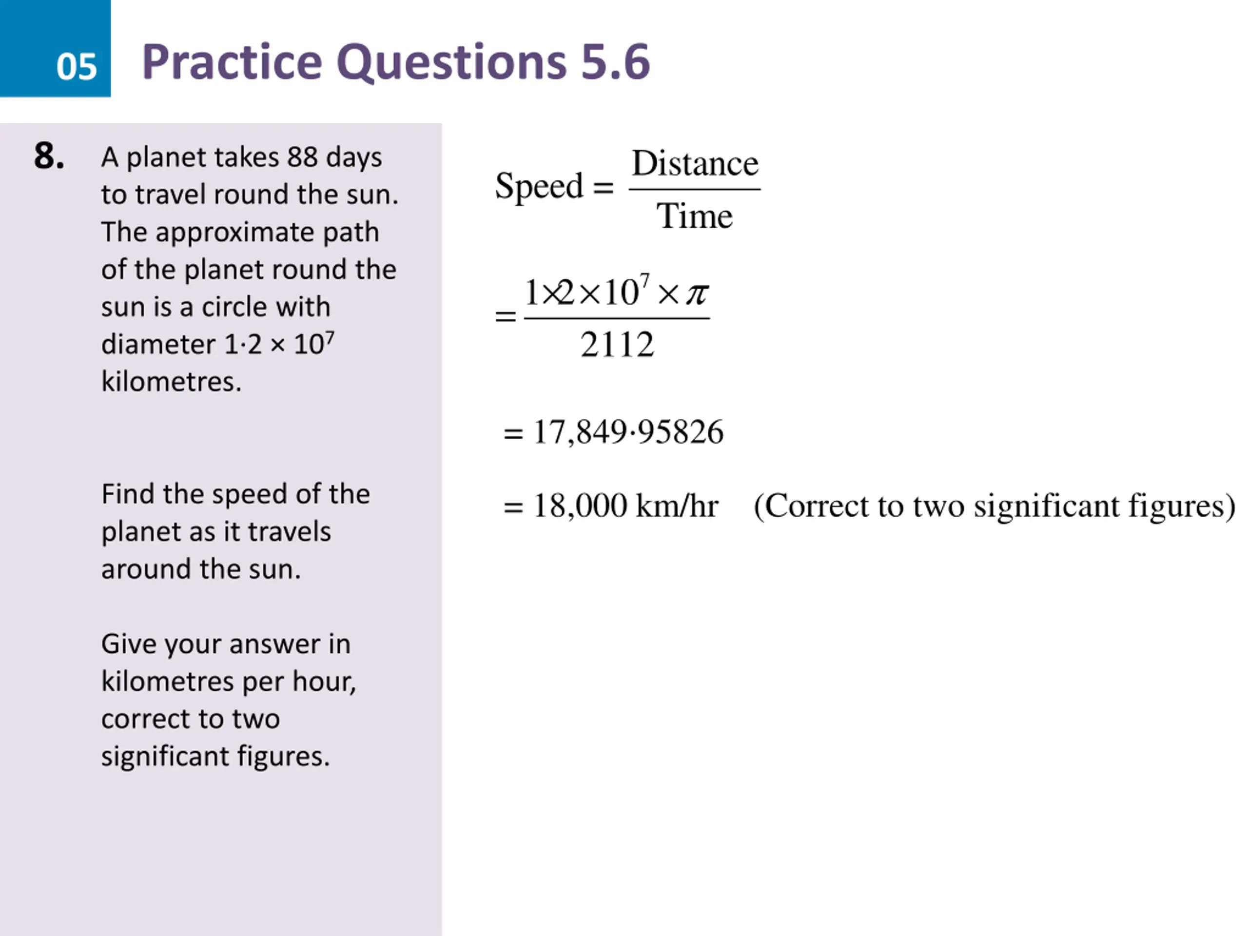 05 Practice Questions 5.6 8. Speed = Distance A planet takes 88 days to travel round the sun. The approximate path of the planet round the sun is a circle with diameter 1 2 107 kilometres. Time =1 2 107 p 2112 = 17,849 95826 Find the speed of the planet as it travels around the sun. = 18,000 km/hr (Correct to two significant figures) Give your answer in kilometres per hour, correct to two significant figures.