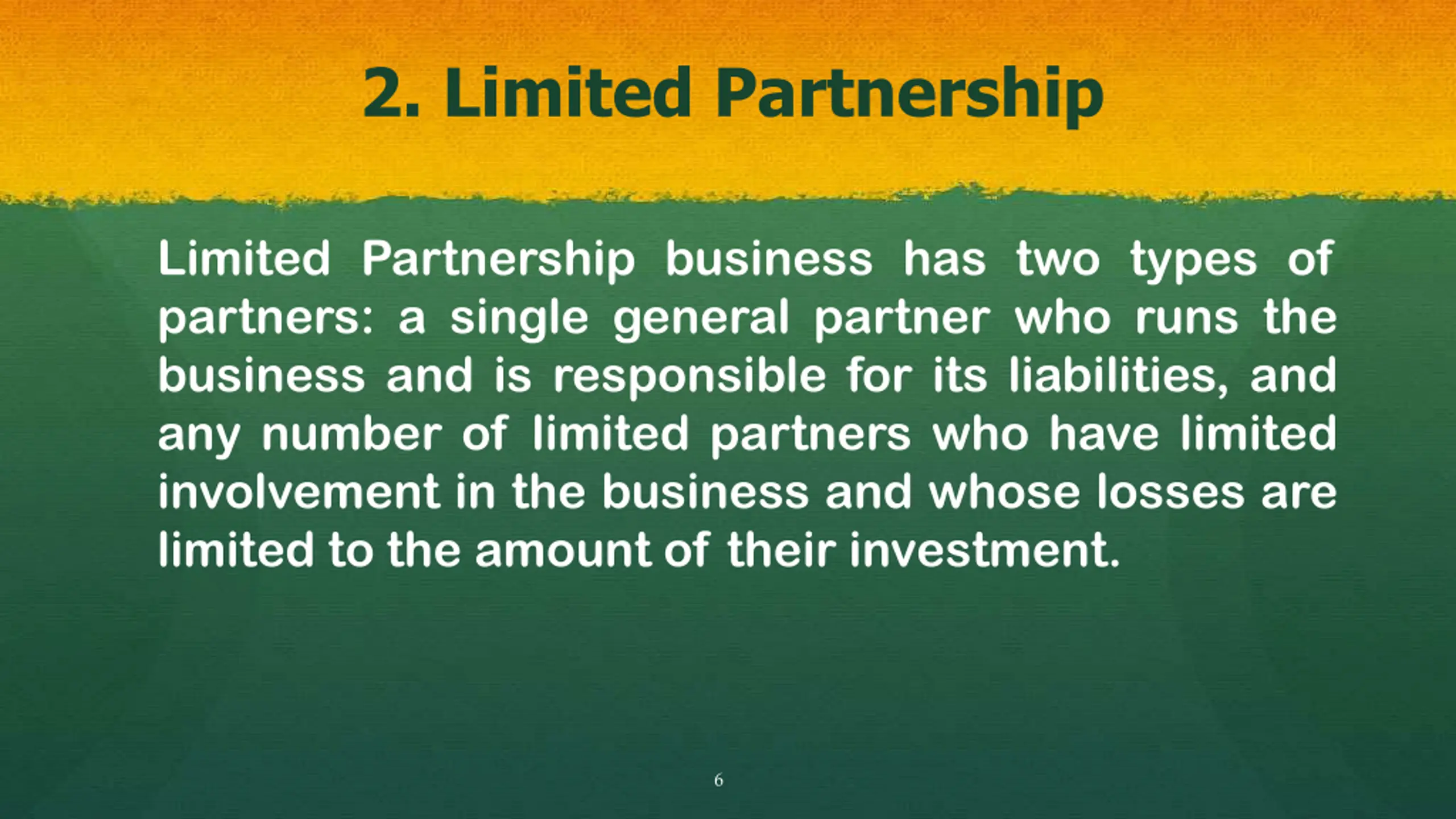 2. Limited Partnership Limited Partnership business has two types of partners: a single general partner who runs the business and is responsible for its liabilities, and any number of limited partners who have limited involvement in the business and whose losses are limited to the amount of their investment. 6
