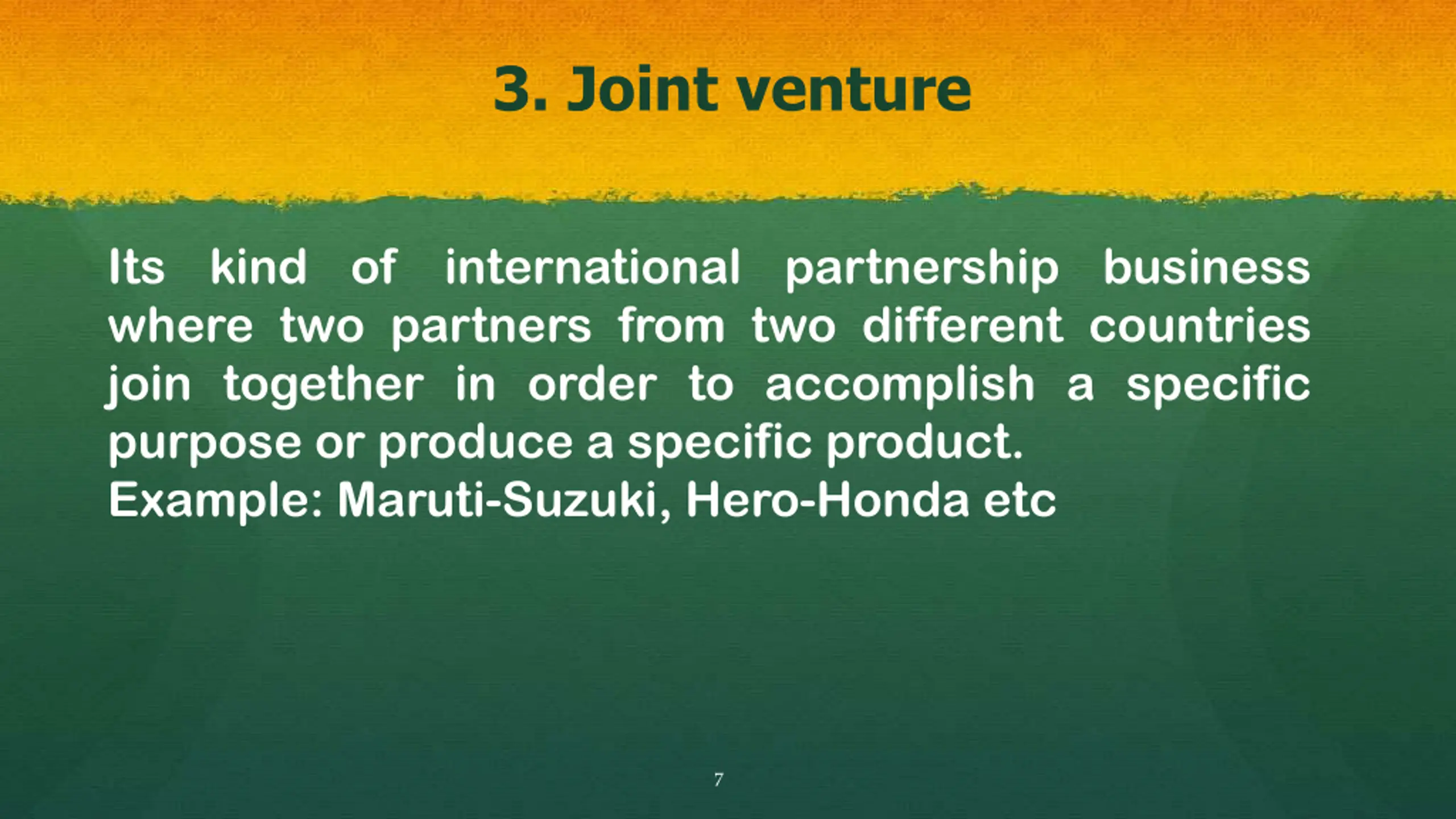 3. Joint venture Its kind of international partnership business where two partners from two different countries join together in order to accomplish a specific purpose or produce a specific product. Example: Maruti-Suzuki, Hero-Honda etc 7