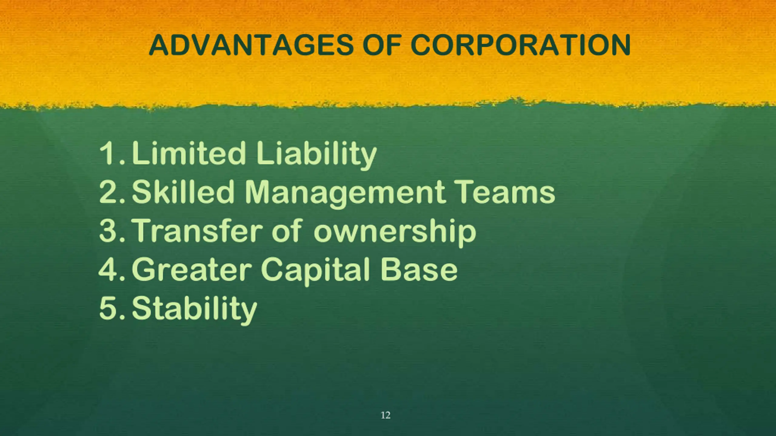 ADVANTAGES OF CORPORATION 1.Limited Liability 2.Skilled Management Teams 3.Transfer of ownership 4.Greater Capital Base 5.Stability 12