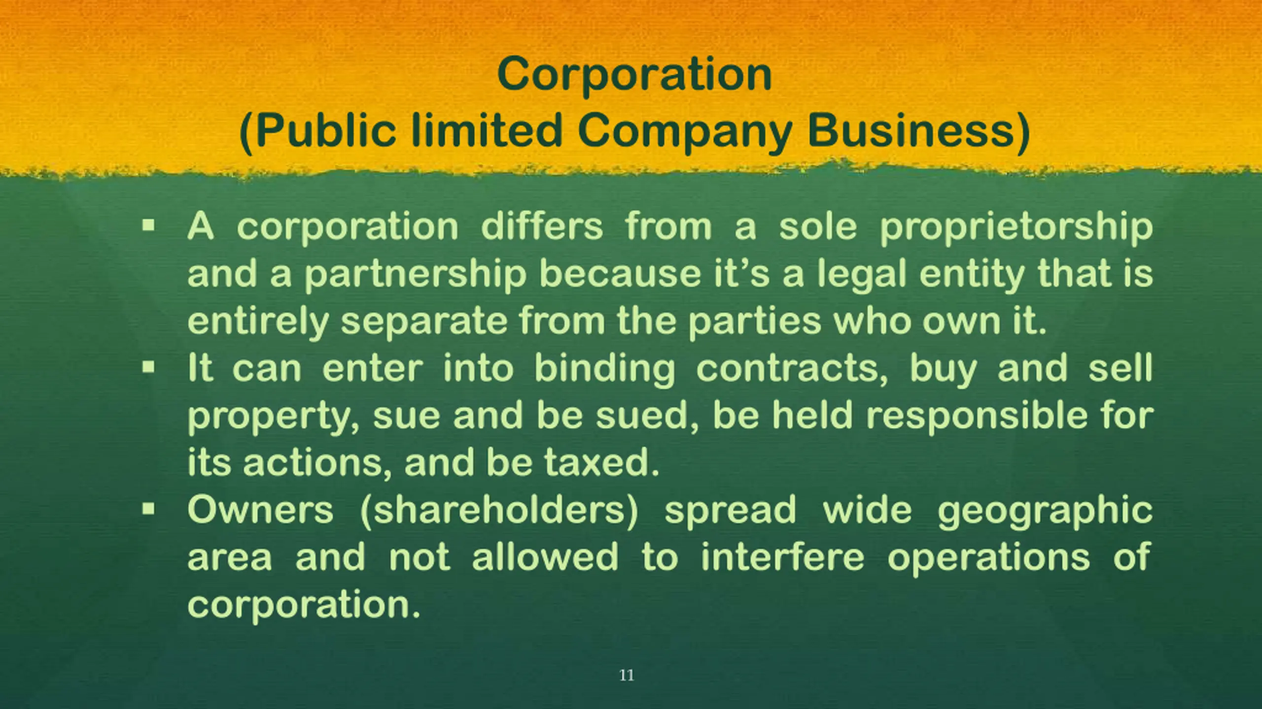Corporation (Public limited Company Business) A corporation differs from a sole proprietorship and a partnership because it s a legal entity that is entirely separate from the parties who own it. It can enter into binding contracts, buy and sell property, sue and be sued, be held responsible for its actions, and be taxed. Owners (shareholders) spread wide geographic area and not allowed to interfere operations of corporation. 11