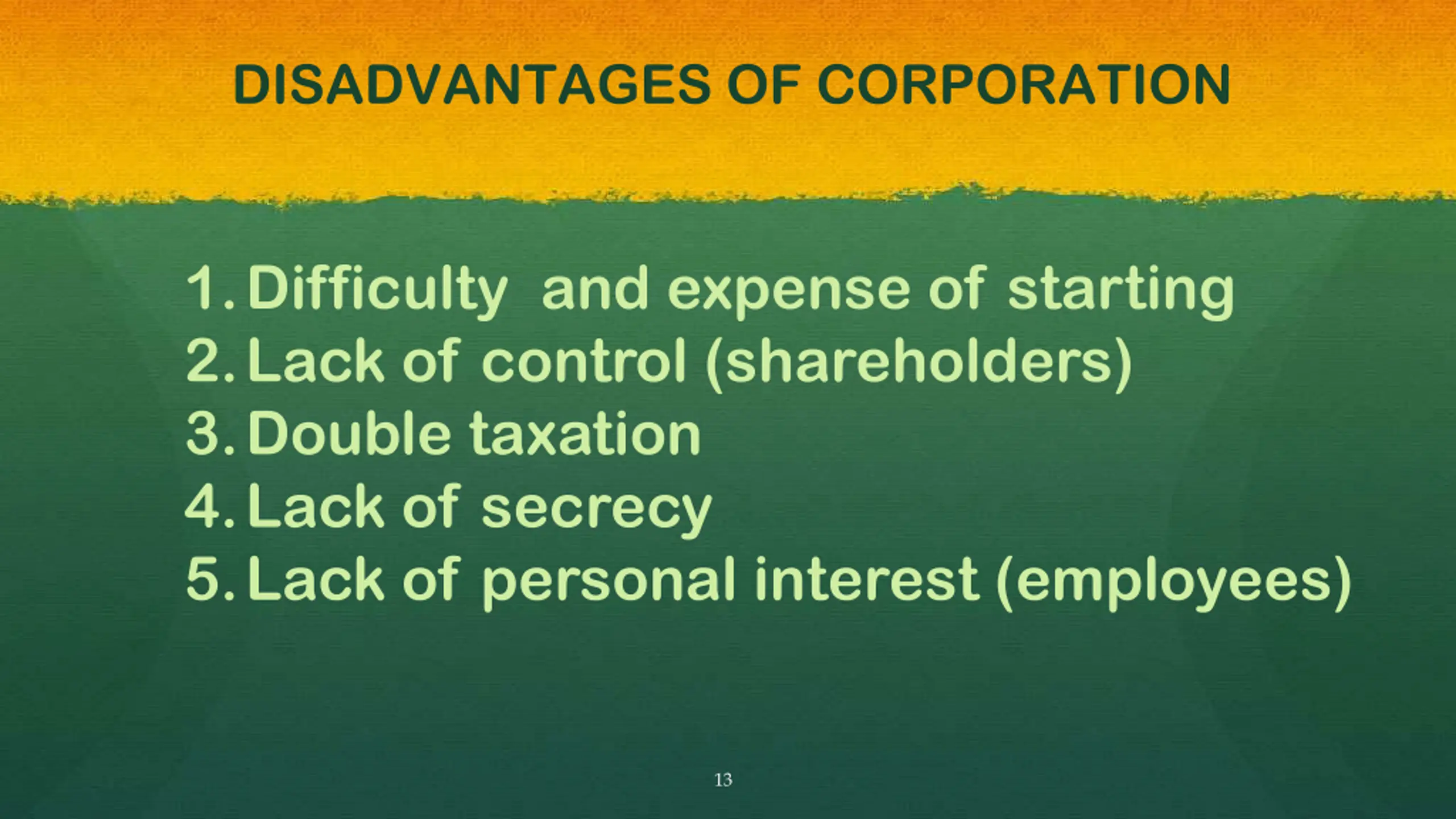 DISADVANTAGES OF CORPORATION 1.Difficulty and expense of starting 2.Lack of control (shareholders) 3.Double taxation 4.Lack of secrecy 5.Lack of personal interest (employees) 13