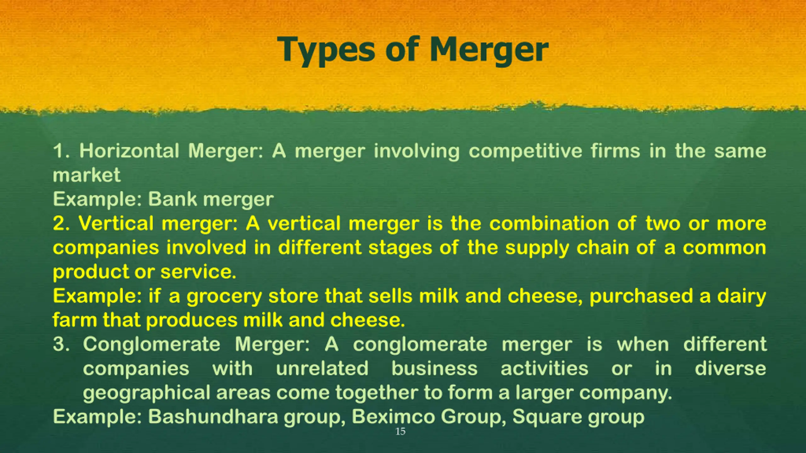 Types of Merger 1. Horizontal Merger: A merger involving competitive firms in the same market Example: Bank merger 2. Vertical merger: A vertical merger is the combination of two or more companies involved in different stages of the supply chain of a common product or service. Example: if a grocery store that sells milk and cheese, purchased a dairy farm that produces milk and cheese. 3. Conglomerate Merger: A conglomerate merger is when different companies with unrelated business activities or in diverse geographical areas come together to form a larger company. Example: Bashundhara group, Beximco Group, Square group 15
