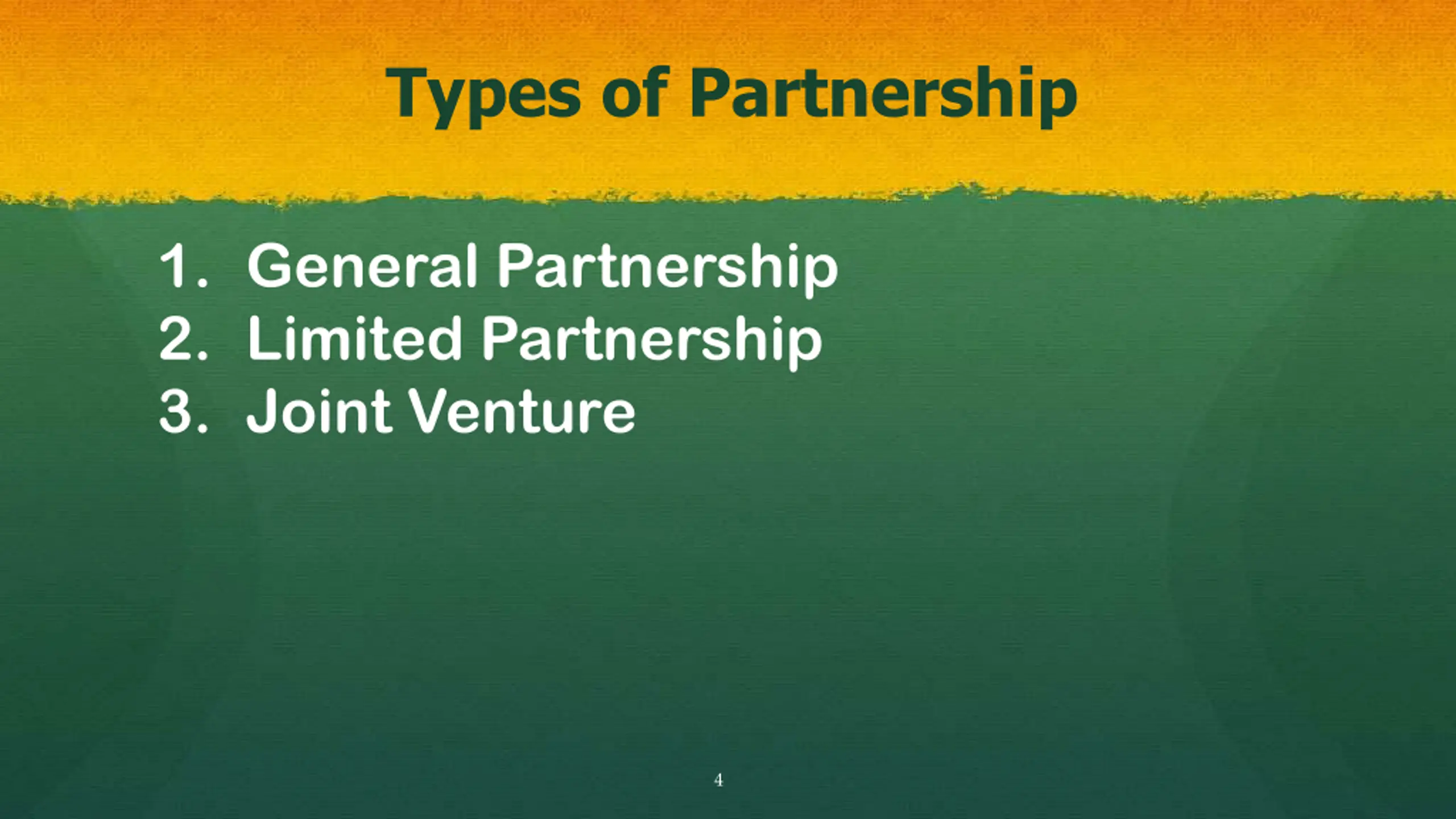 Types of Partnership 1. General Partnership 2. Limited Partnership 3. Joint Venture 4