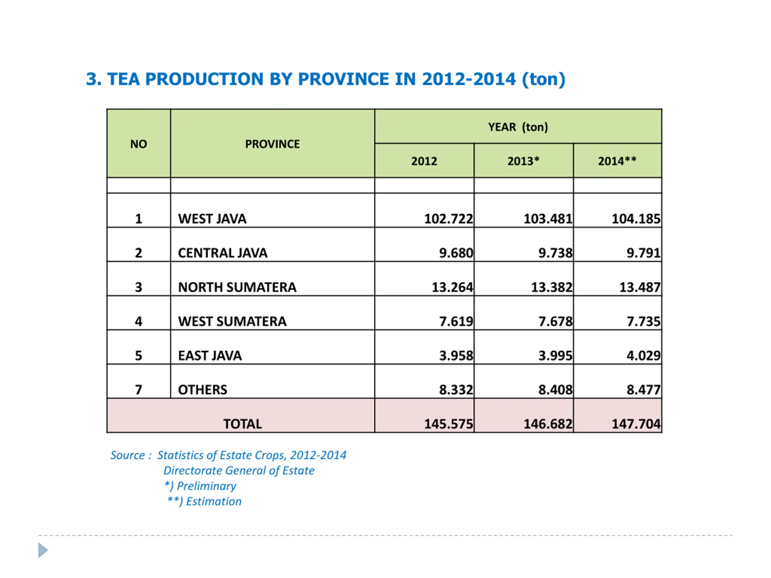 3. TEA PRODUCTION BY PROVINCE IN 2012-2014 (ton) YEAR (ton) NO PROVINCE 2012 2013* 2014** 1 WEST JAVA 102.722 103.481 104.185 2 CENTRAL JAVA 9.680 9.738 9.791 3 NORTH SUMATERA 13.264 13.382 13.487 4 WEST SUMATERA 7.619 7.678 7.735 5 EAST JAVA 3.958 3.995 4.029 7 OTHERS 8.332 8.408 8.477 TOTAL 145.575 146.682 147.704 Source : Statistics of Estate Crops, 2012-2014 Directorate General of Estate *) Preliminary **) Estimation