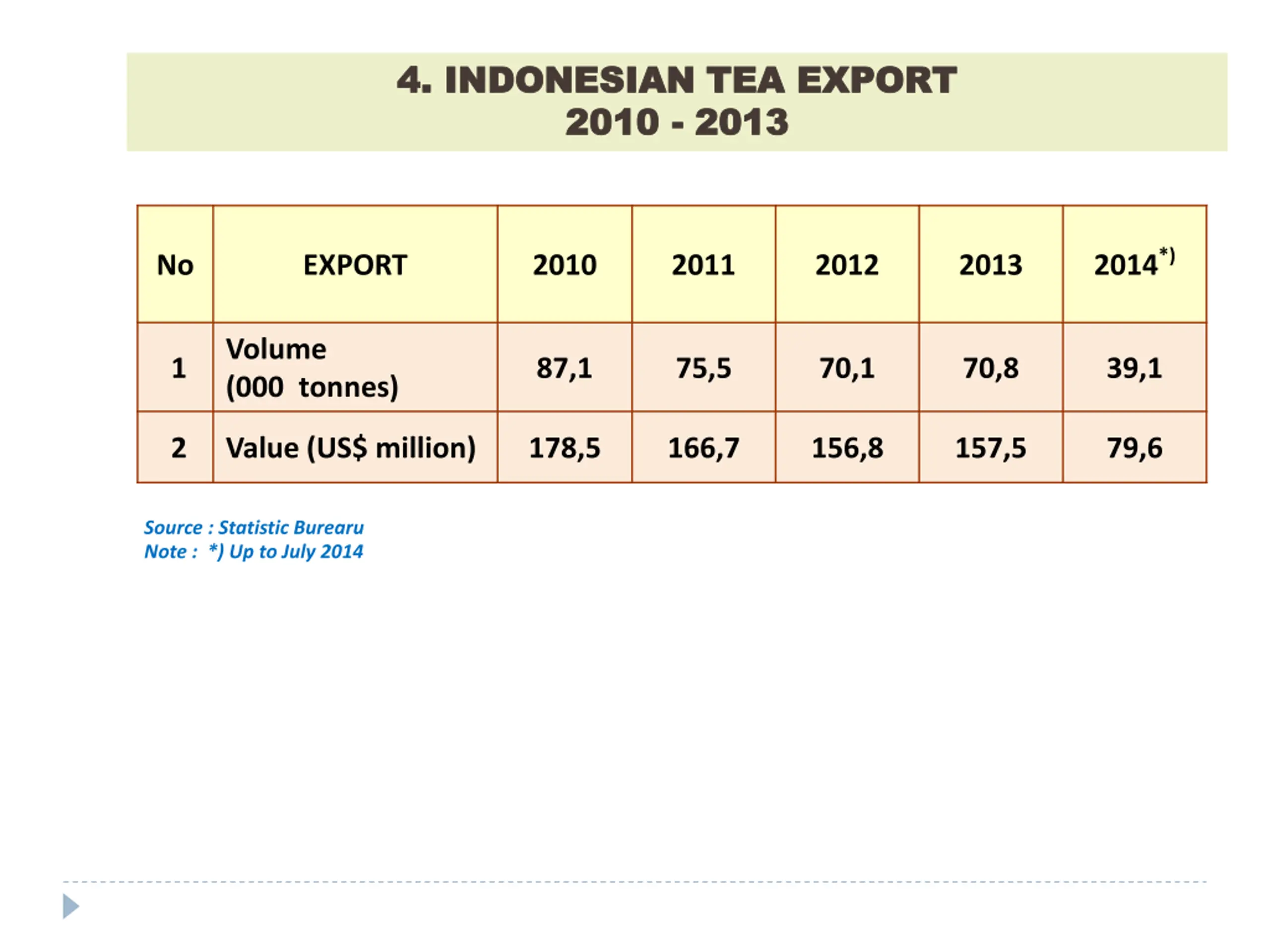 4. 4. INDONESIAN TEA INDONESIAN TEA EXPORT 2010 2010 - - 2013 EXPORT 2013 2014*) No EXPORT 2010 2011 2012 2013 Volume (000 tonnes) 1 87,1 75,5 70,1 70,8 39,1 2 Value (US$ million) 178,5 166,7 156,8 157,5 79,6 Source : Statistic Burearu Note : *) Up to July 2014
