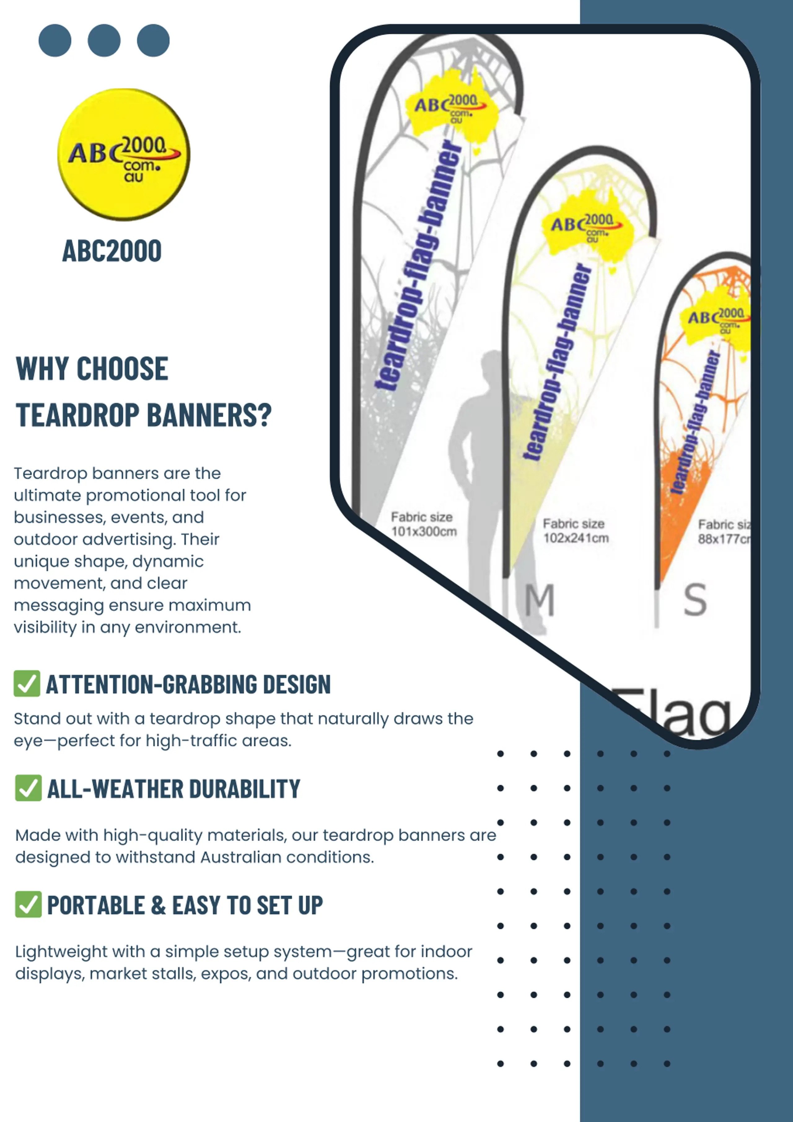 ABC2000 WHY CHOOSE TEARDROP BANNERS? Teardrop banners are the ultimate promotional tool for businesses, events, and outdoor advertising. Their unique shape, dynamic movement, and clear messaging ensure maximum visibility in any environment. ATTENTION-GRABBING DESIGN Stand out with a teardrop shape that naturally draws the eye perfect for high-traffic areas. ALL-WEATHER DURABILITY Made with high-quality materials, our teardrop banners are designed to withstand Australian conditions. PORTABLE & EASY TO SET UP Lightweight with a simple setup system great for indoor displays, market stalls, expos, and outdoor promotions.