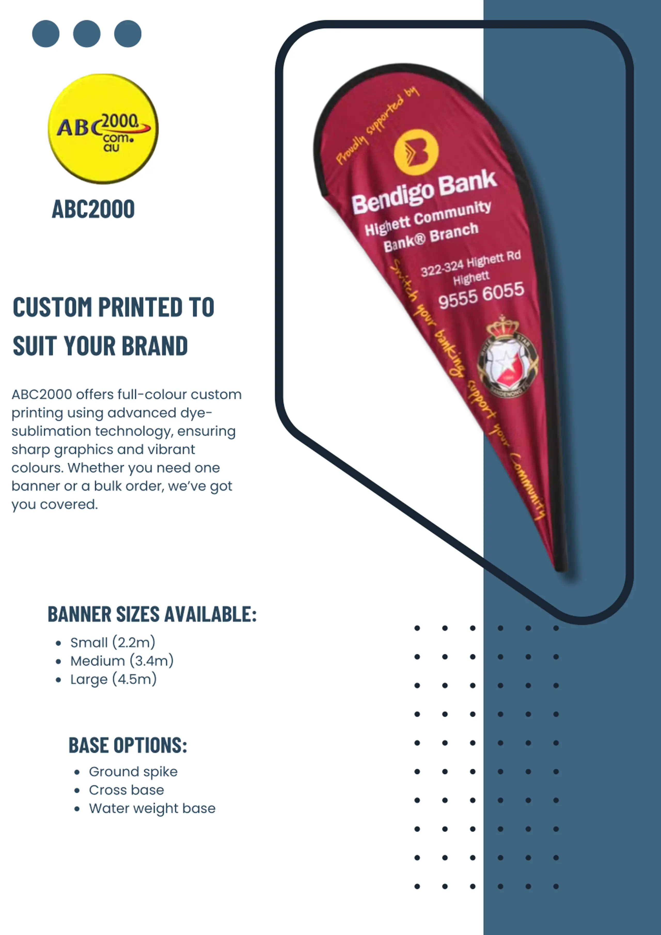 ABC2000 CUSTOM PRINTED TO SUIT YOUR BRAND ABC2000 offers full-colour custom printing using advanced dye- sublimation technology, ensuring sharp graphics and vibrant colours. Whether you need one banner or a bulk order, we ve got you covered. BANNER SIZES AVAILABLE: Small (2.2m) Medium (3.4m) Large (4.5m) BASE OPTIONS: Ground spike Cross base Water weight base