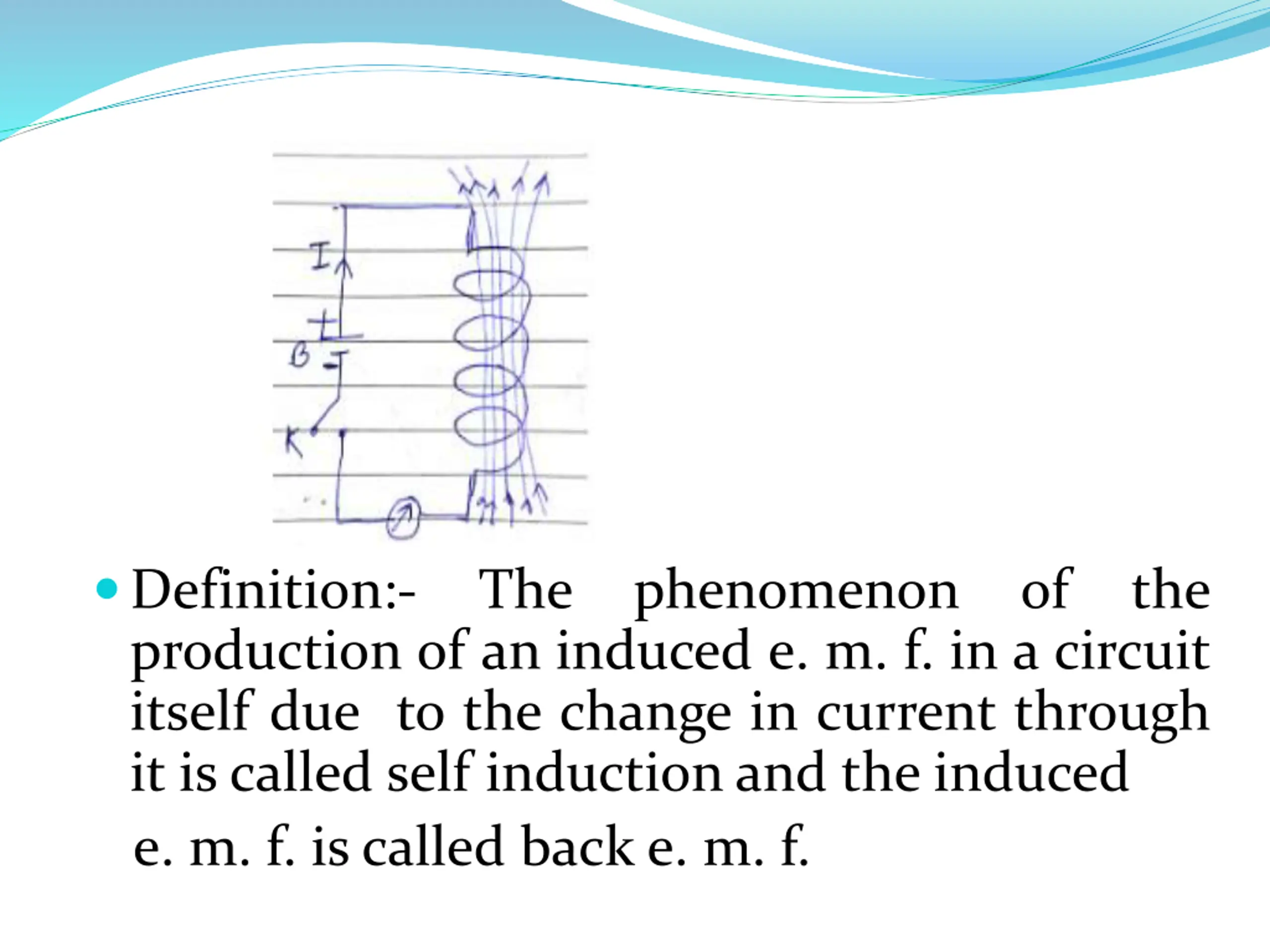 Definition:- production of an induced e. m. f. in a circuit itself due to the change in current through it is called self induction and the induced e. m. f. is called back e. m. f. The phenomenon of the