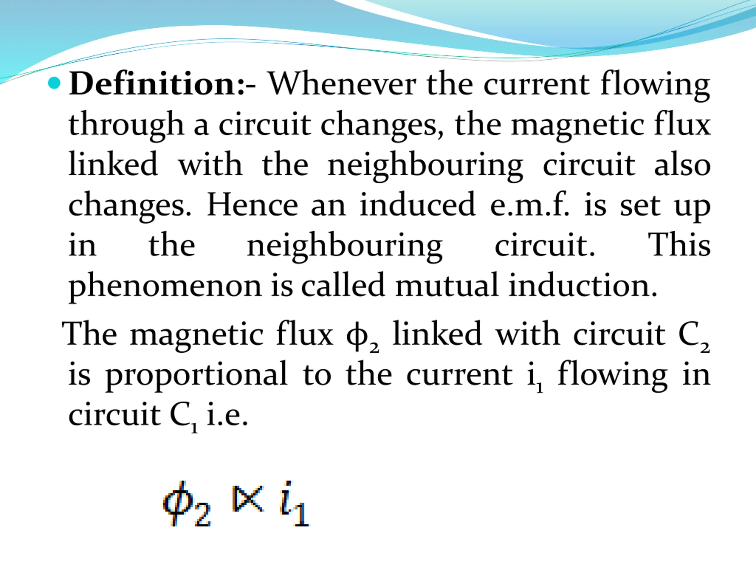Definition:- Whenever the current flowing through a circuit changes, the magnetic flux linked with the neighbouring circuit also changes. Hence an induced e.m.f. is set up in the neighbouring phenomenon is called mutual induction. The magnetic flux 2linked with circuit C2 is proportional to the current i1flowing in circuit C1i.e. circuit. This