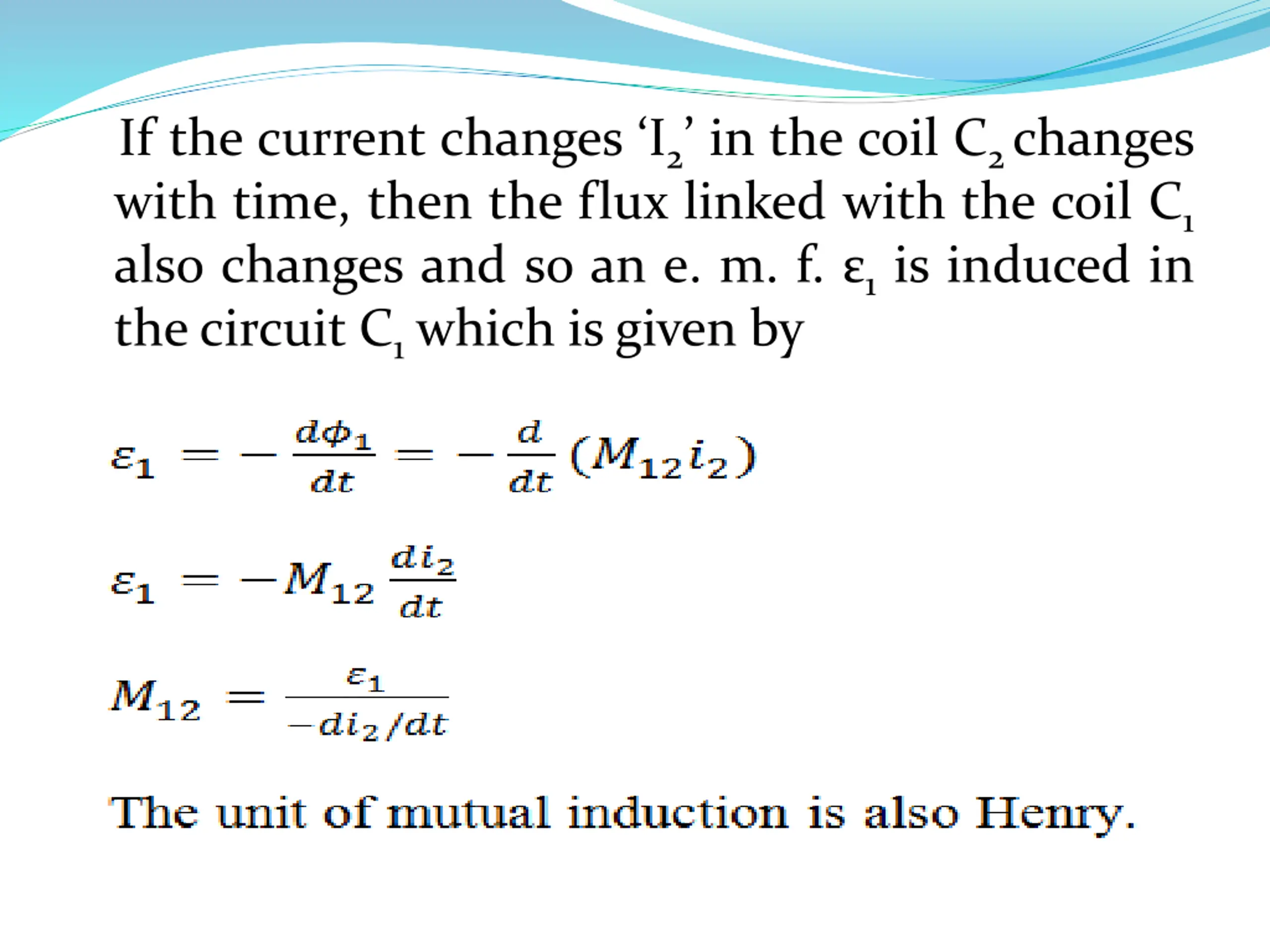 If the current changes I2 in the coil C2changes with time, then the flux linked with the coil C1 also changes and so an e. m. f. 1is induced in thecircuit C1which is given by