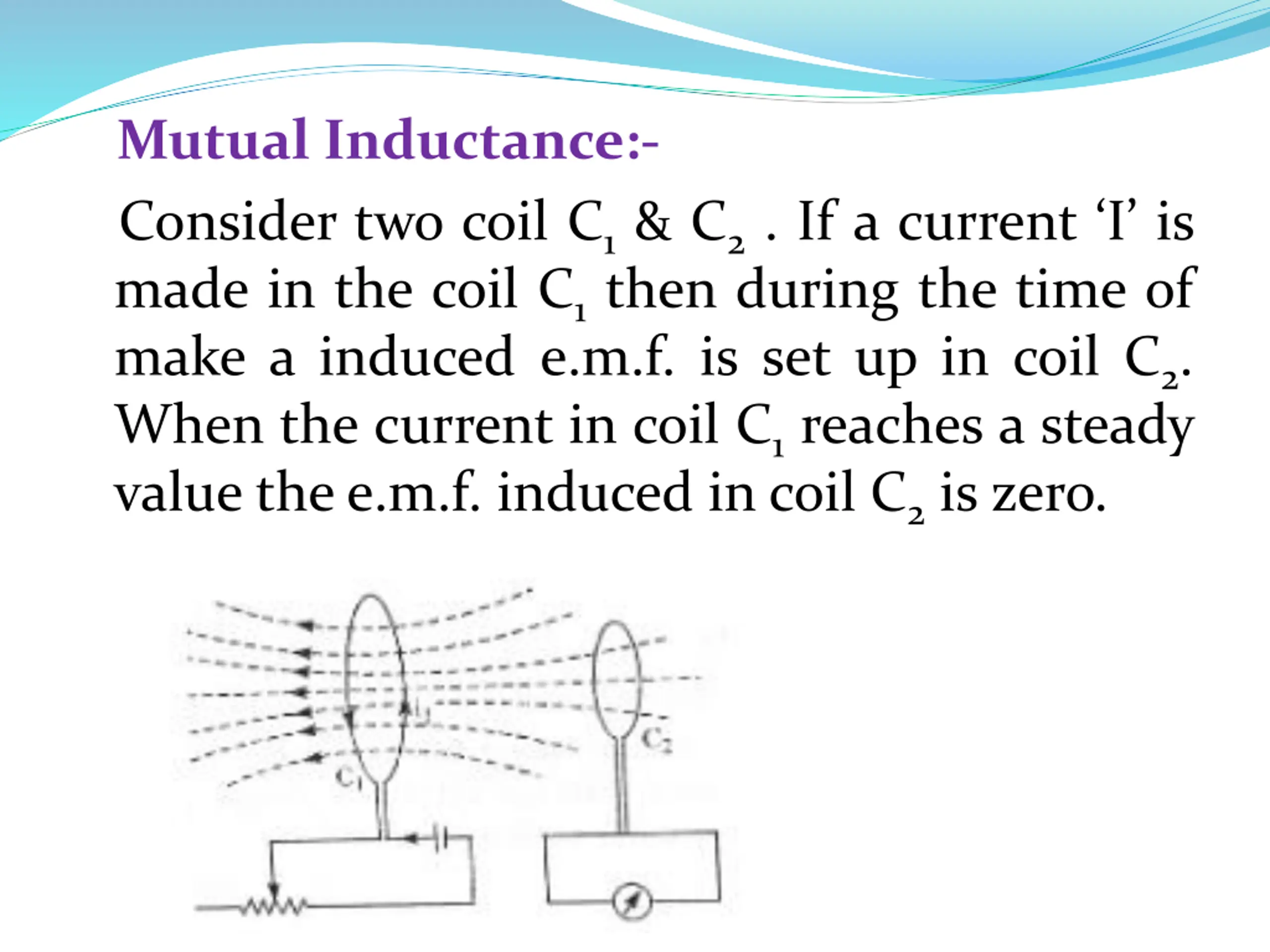 Mutual Inductance:- Consider two coil C1& C2. If a current I is made in the coil C1then during the time of make a induced e.m.f. is set up in coil C2. When the current in coil C1reaches a steady value thee.m.f. induced in coil C2is zero.