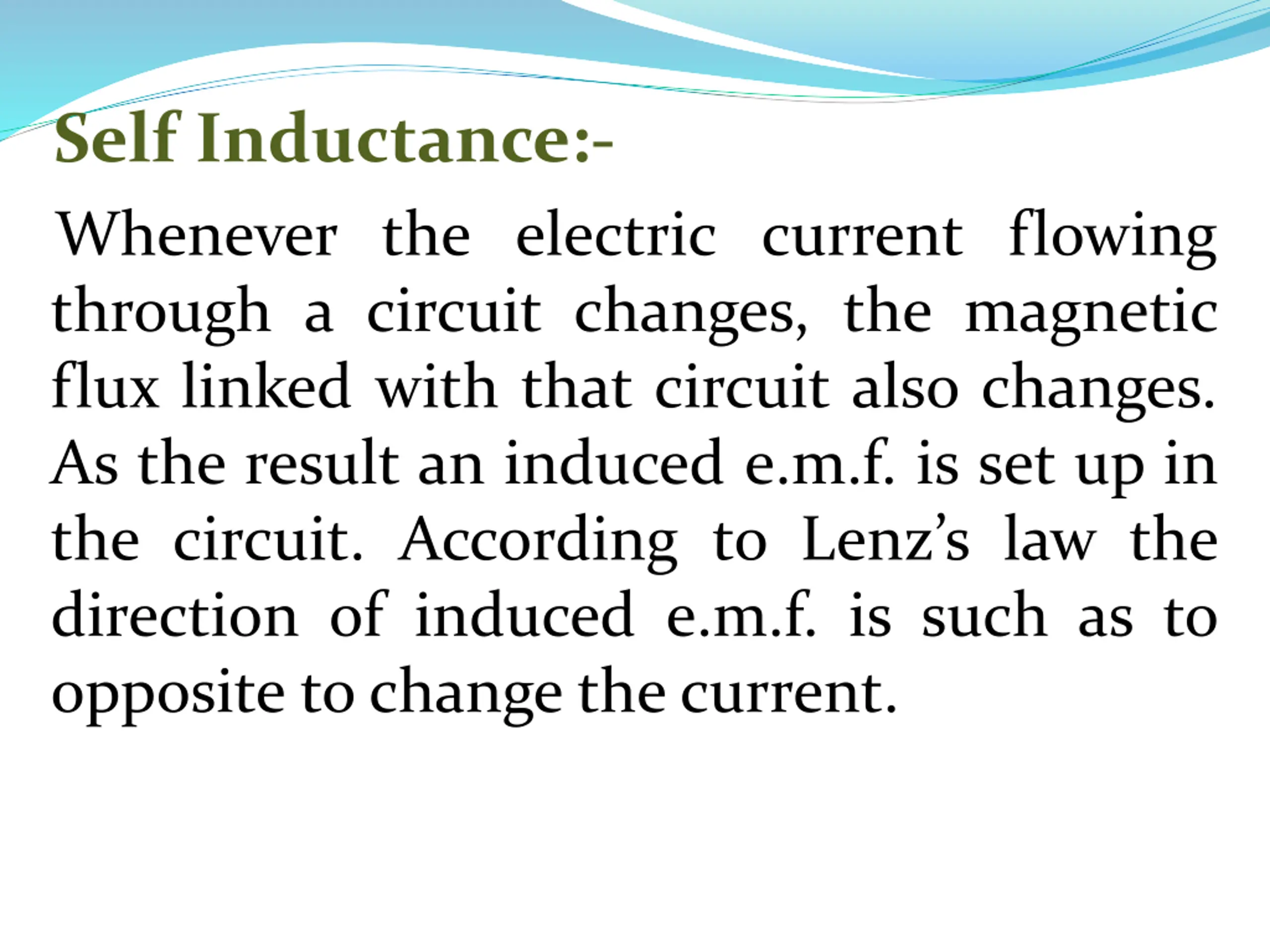 Self Inductance:- Whenever the electric current flowing through a circuit changes, the magnetic flux linked with that circuit also changes. As the result an induced e.m.f. is set up in the circuit. According to Lenz s law the direction of induced e.m.f. is such as to opposite to change the current.