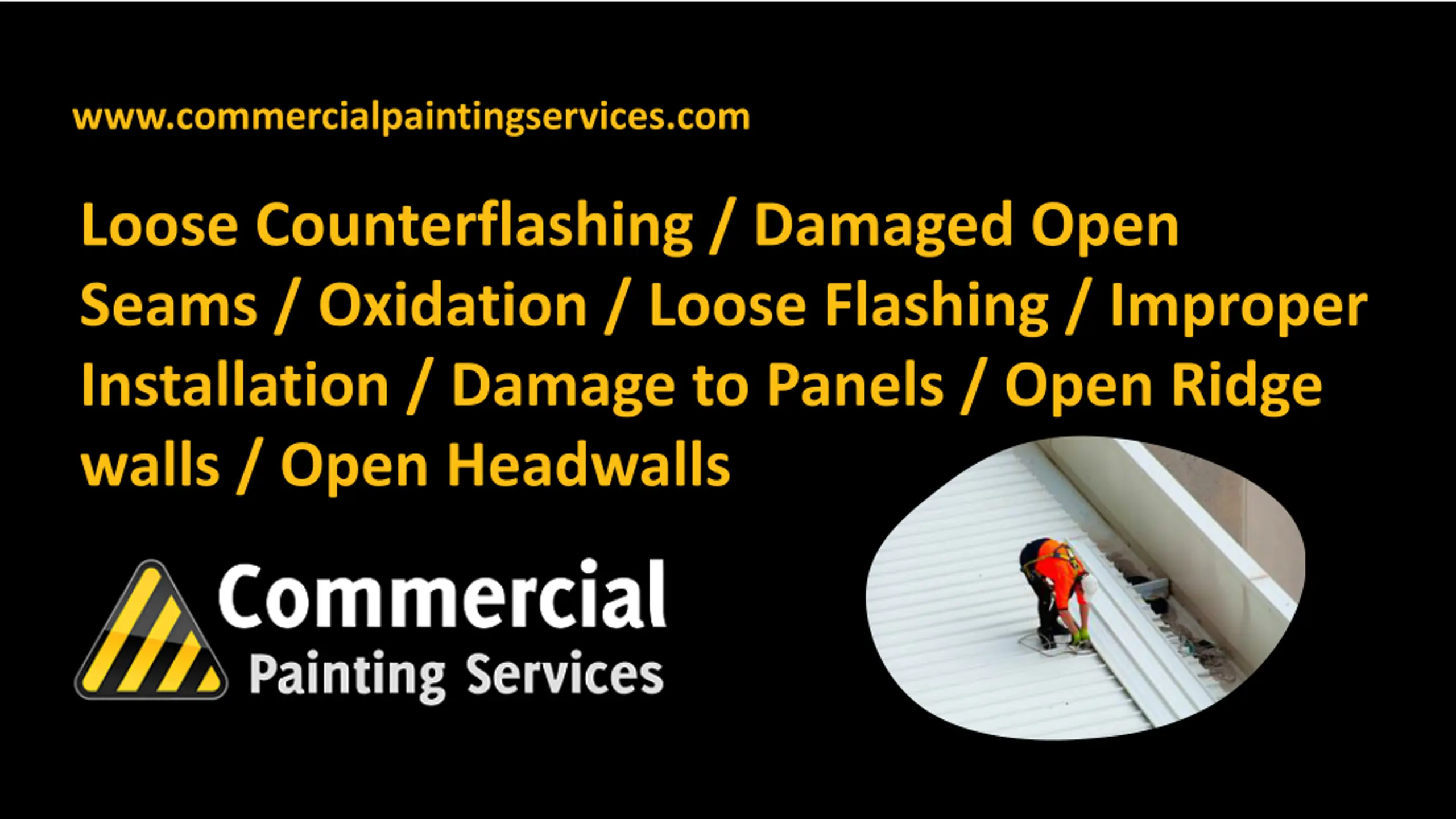 www.commercialpaintingservices.com Loose Counterflashing / Damaged Open Seams / Oxidation / Loose Flashing / Improper Installation / Damage to Panels / Open Ridge walls / Open Headwalls
