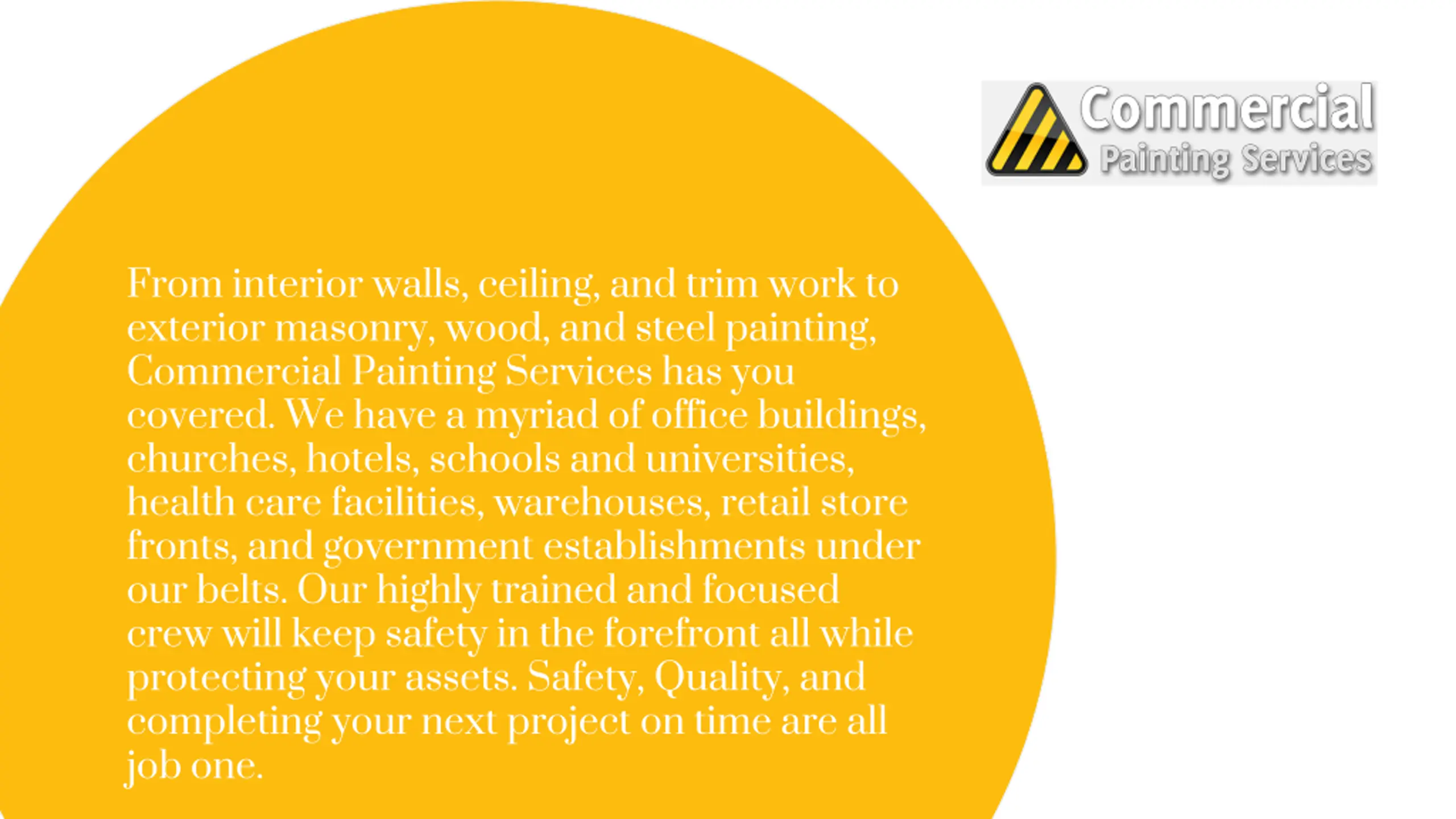 From interior walls, ceiling, and trim work to exterior masonry, wood, and steel painting, Commercial Painting Services has you covered. We have a myriad of office buildings, churches, hotels, schools and universities, health care facilities, warehouses, retail store fronts, and government establishments under our belts. Our highly trained and focused crew will keep safety in the forefront all while protecting your assets. Safety, Quality, and completing your next project on time are all job one.