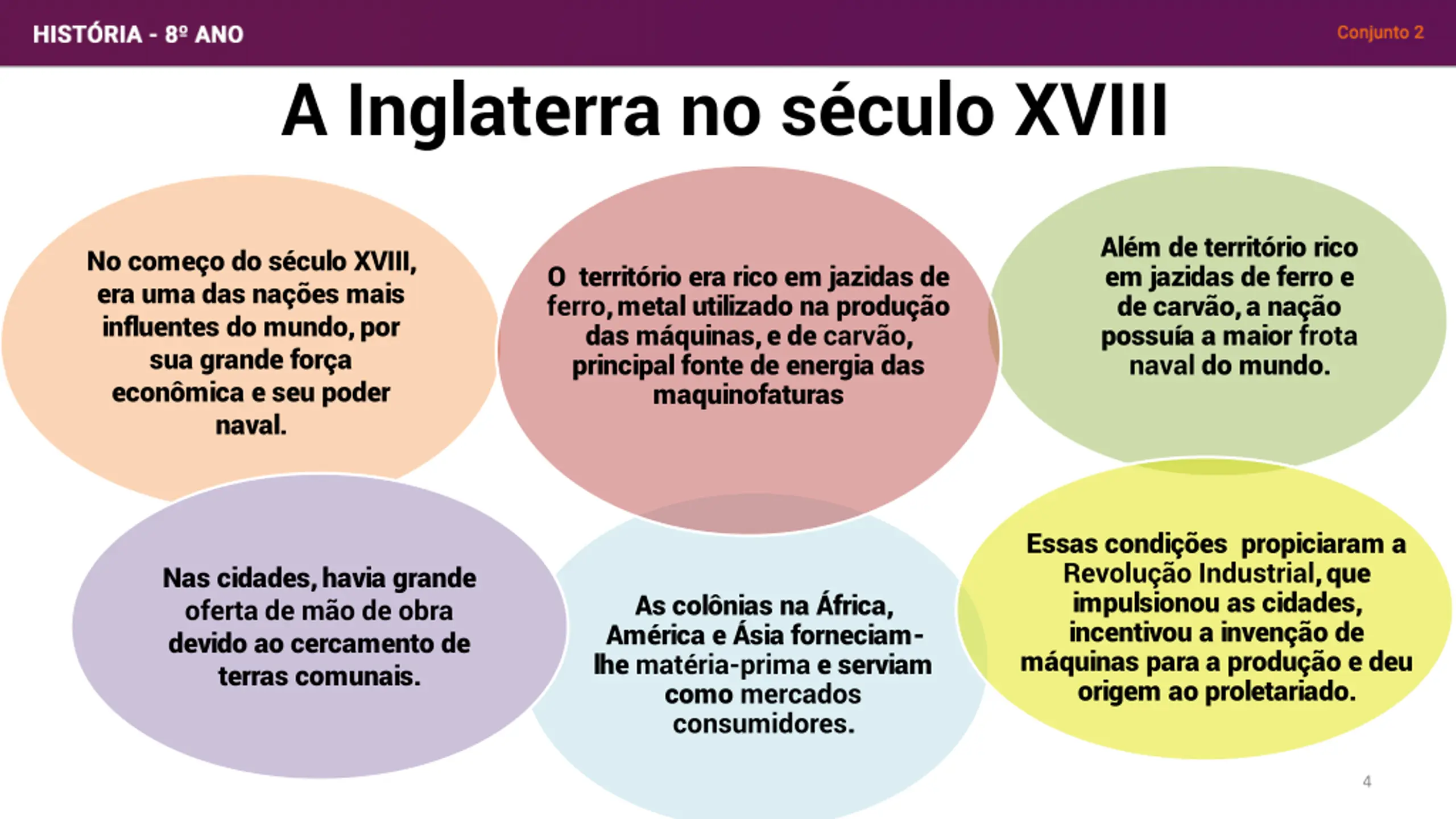 A Inglaterra no sculo XVIII Al m de territ rio rico em jazidas de ferro e de carv o, a na o possu a a maior frota naval do mundo. No come o do s culo XVIII, era uma das na es mais influentes do mundo, por sua grande for a econ mica e seu poder naval. O territ rio era rico em jazidas de ferro, metal utilizado na produ o das m quinas, e de carv o, principal fonte de energia das maquinofaturas Essas condi es propiciaram a Revolu o Industrial, que impulsionou as cidades, incentivou a inven o de m quinas para a produ o e deu origem ao proletariado. Nas cidades, havia grande oferta de m o de obra devido ao cercamento de terras comunais. As col nias na frica, Am rica e sia forneciam- lhe mat ria-prima e serviam como mercados consumidores. 4