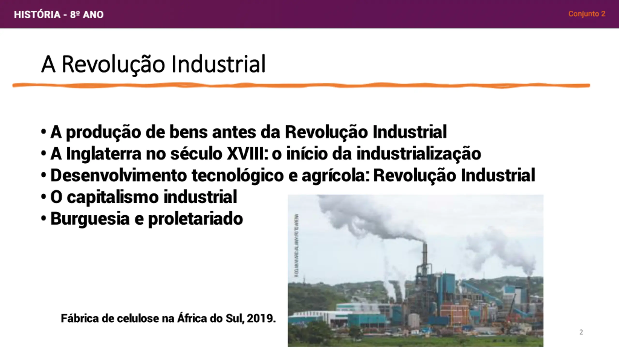 A Revoluo Industrial A Revolu o Industrial A produ o de bens antes da Revolu o Industrial A Inglaterra no s culo XVIII: o in cio da industrializa o Desenvolvimento tecnol gico e agr cola: Revolu o Industrial O capitalismo industrial Burguesia e proletariado F brica de celulose na frica do Sul, 2019. 2