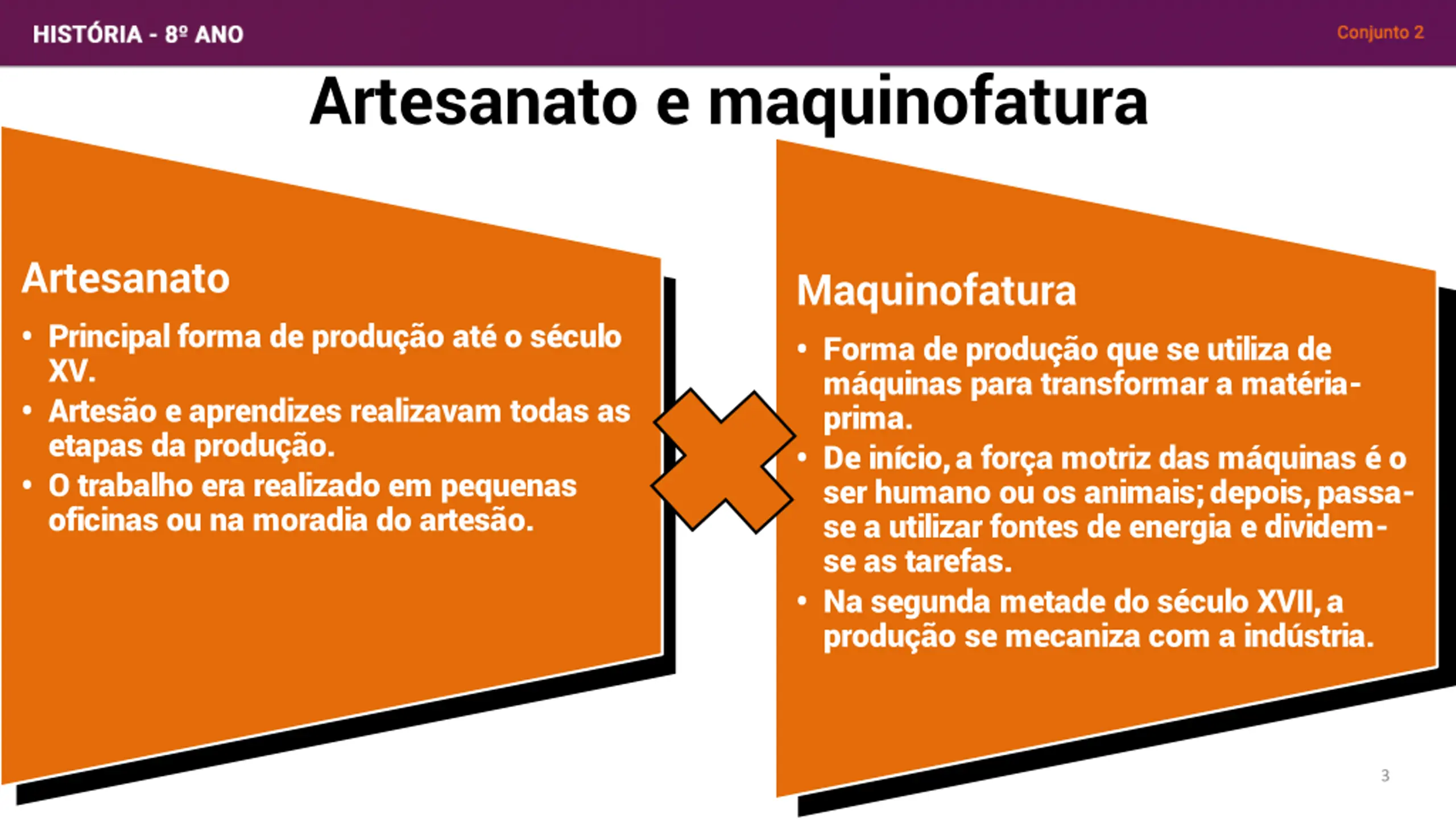 Artesanato e maquinofatura Artesanato Principal forma de produ o at o s culo XV. Artes o e aprendizes realizavam todas as etapas da produ o. O trabalho era realizado em pequenas oficinas ou na moradia do artes o. Maquinofatura Forma de produ o que se utiliza de m quinas para transformar a mat ria- prima. De in cio, a for a motriz das m quinas o ser humano ou os animais; depois, passa- se a utilizar fontes de energia e dividem- se as tarefas. Na segunda metade do s culo XVII, a produ o se mecaniza com a ind stria. 3