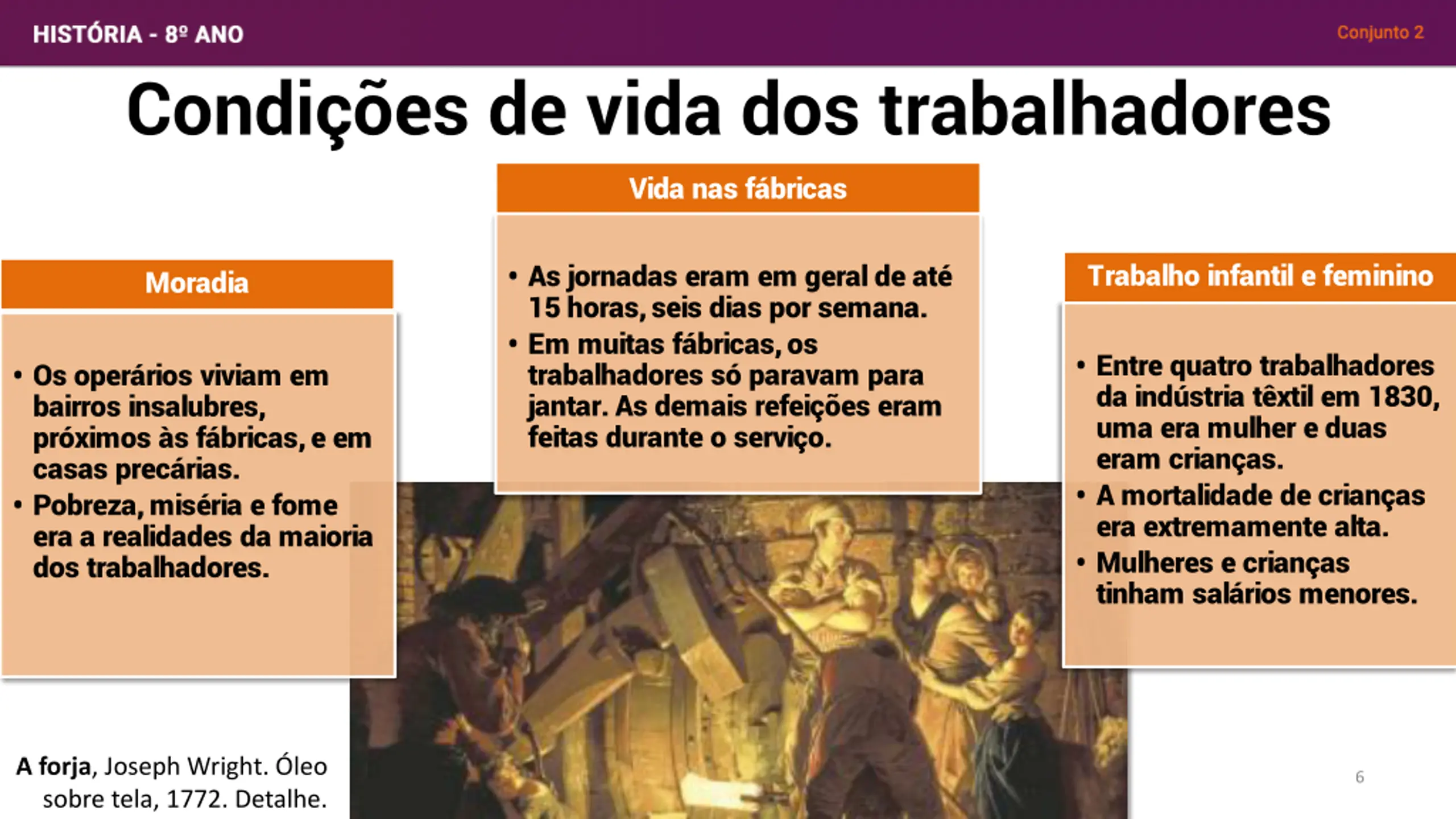 Condies de vida dos trabalhadores Vida nas f bricas Trabalho infantil e feminino As jornadas eram em geral de at 15 horas, seis dias por semana. Em muitas f bricas, os trabalhadores s paravam para jantar. As demais refei es eram feitas durante o servi o. Moradia Entre quatro trabalhadores da ind stria t xtil em 1830, uma era mulher e duas eram crian as. A mortalidade de crian as era extremamente alta. Mulheres e crian as tinham sal rios menores. Os oper rios viviam em bairros insalubres, pr ximos s f bricas, e em casas prec rias. Pobreza, mis ria e fome era a realidades da maioria dos trabalhadores. A forja, Joseph Wright. leo sobre tela, 1772. Detalhe. 6