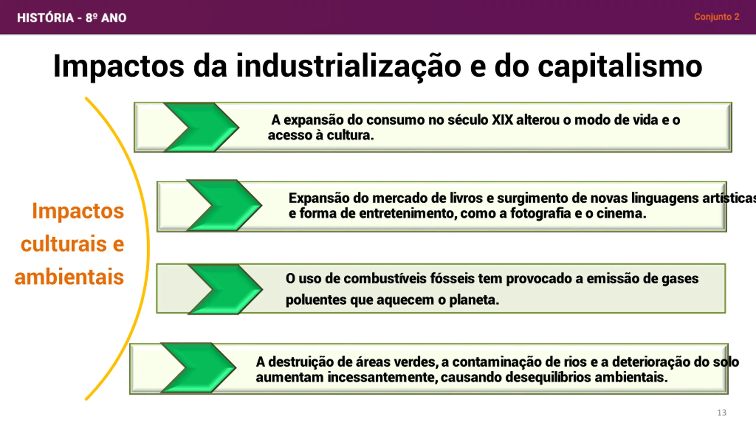 Impactos da industrializao e do capitalismo A expans o do consumo no s culo XIX alterou o modo de vida e o acesso cultura. Expans o do mercado de livros e surgimento de novas linguagens art sticas e forma de entretenimento, como a fotografia e o cinema. Impactos culturais e ambientais O uso de combust veis f sseis tem provocado a emiss o de gases poluentes que aquecem o planeta. A destrui o de reas verdes, a contamina o de rios e a deteriora o do solo aumentam incessantemente, causando desequil brios ambientais. 13