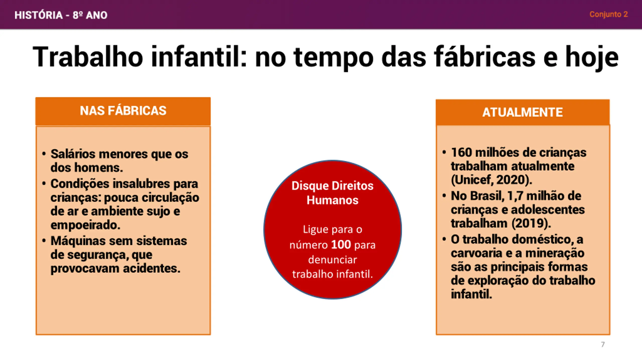 Trabalho infantil: no tempo das fbricas e hoje NAS F BRICAS ATUALMENTE 160 milh es de crian as trabalham atualmente (Unicef, 2020). No Brasil, 1,7 milh o de crian as e adolescentes trabalham (2019). O trabalho dom stico, a carvoaria e a minera o s o as principais formas de explora o do trabalho infantil. Sal rios menores que os dos homens. Condi es insalubres para crian as: pouca circula o de ar e ambiente sujo e empoeirado. M quinas sem sistemas de seguran a, que provocavam acidentes. Disque Direitos Humanos Ligue para o n mero 100 para denunciar trabalho infantil. 7