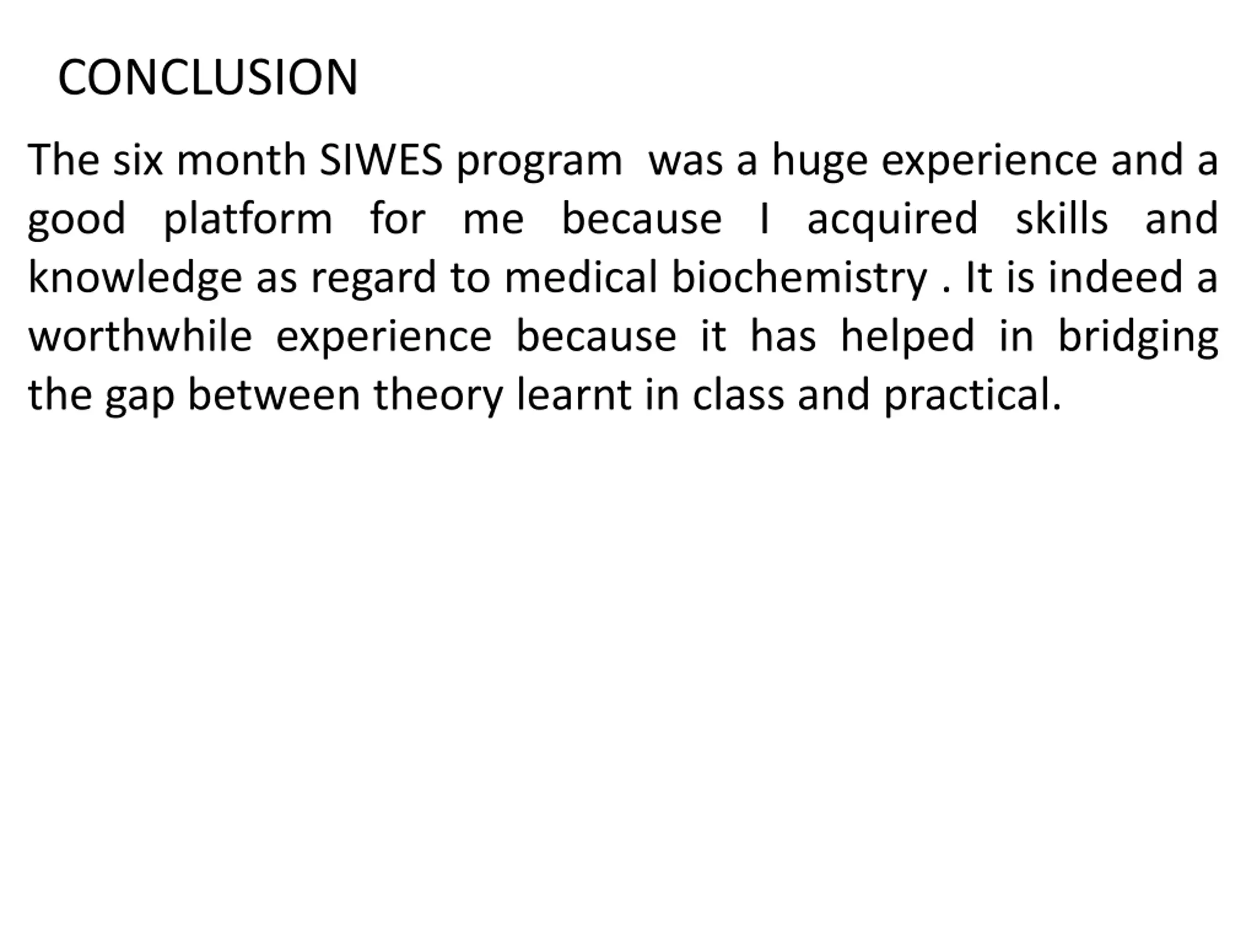 CONCLUSION The six month SIWES program was a huge experience and a good platform for me because I acquired skills and knowledge as regard to medical biochemistry . It is indeed a worthwhile experience because it has helped in bridging the gap between theory learnt in class and practical.