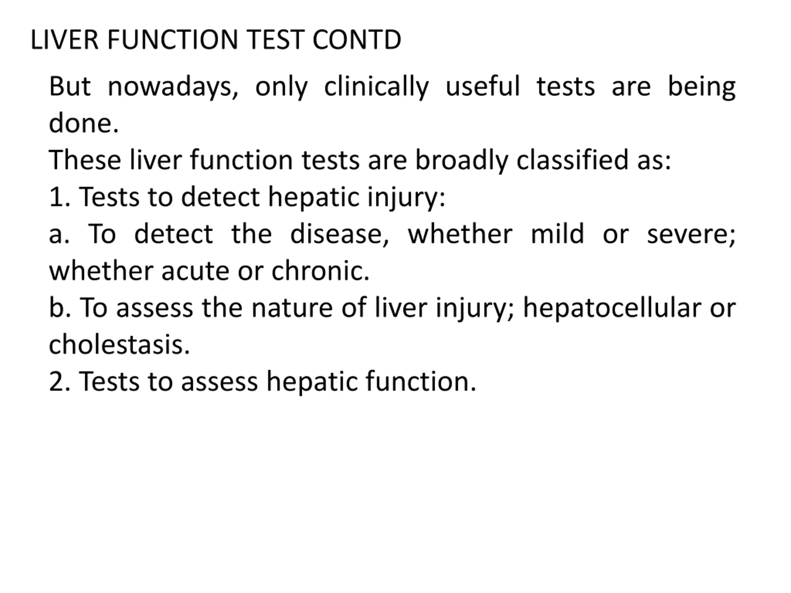 LIVER FUNCTION TEST CONTD But nowadays, only clinically useful tests are being done. These liver function tests are broadly classified as: 1. Tests to detect hepatic injury: a. To detect the disease, whether mild or severe; whether acute or chronic. b. To assess the nature of liver injury; hepatocellular or cholestasis. 2. Tests to assess hepatic function.