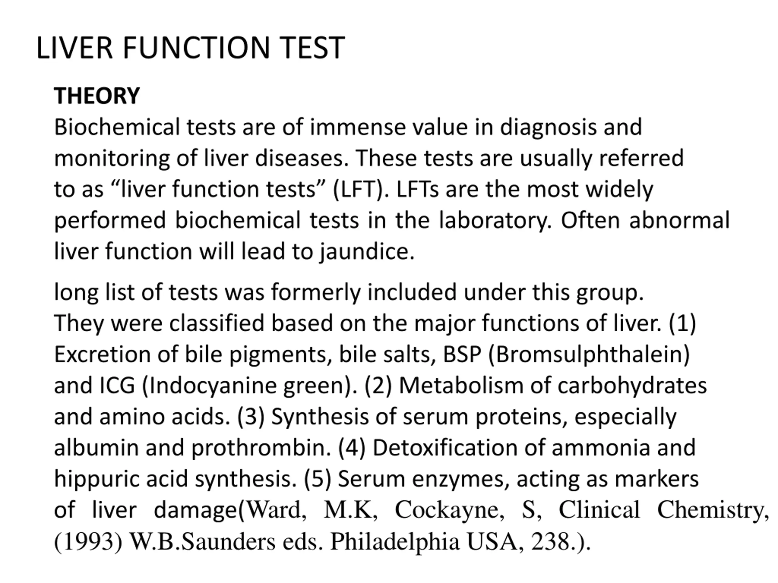 LIVER FUNCTION TEST THEORY Biochemical tests are of immense value in diagnosis and monitoring of liver diseases. These tests are usually referred to as liver function tests (LFT). LFTs are the most widely performed biochemical tests in the laboratory. Often abnormal liver function will lead to jaundice. long list of tests was formerly included under this group. They were classified based on the major functions of liver. (1) Excretion of bile pigments, bile salts, BSP (Bromsulphthalein) and ICG (Indocyanine green). (2) Metabolism of carbohydrates and amino acids. (3) Synthesis of serum proteins, especially albumin and prothrombin. (4) Detoxification of ammonia and hippuric acid synthesis. (5) Serum enzymes, acting as markers of liver damage(Ward, M.K, Cockayne, S, Clinical Chemistry, (1993) W.B.Saunders eds. Philadelphia USA, 238.).