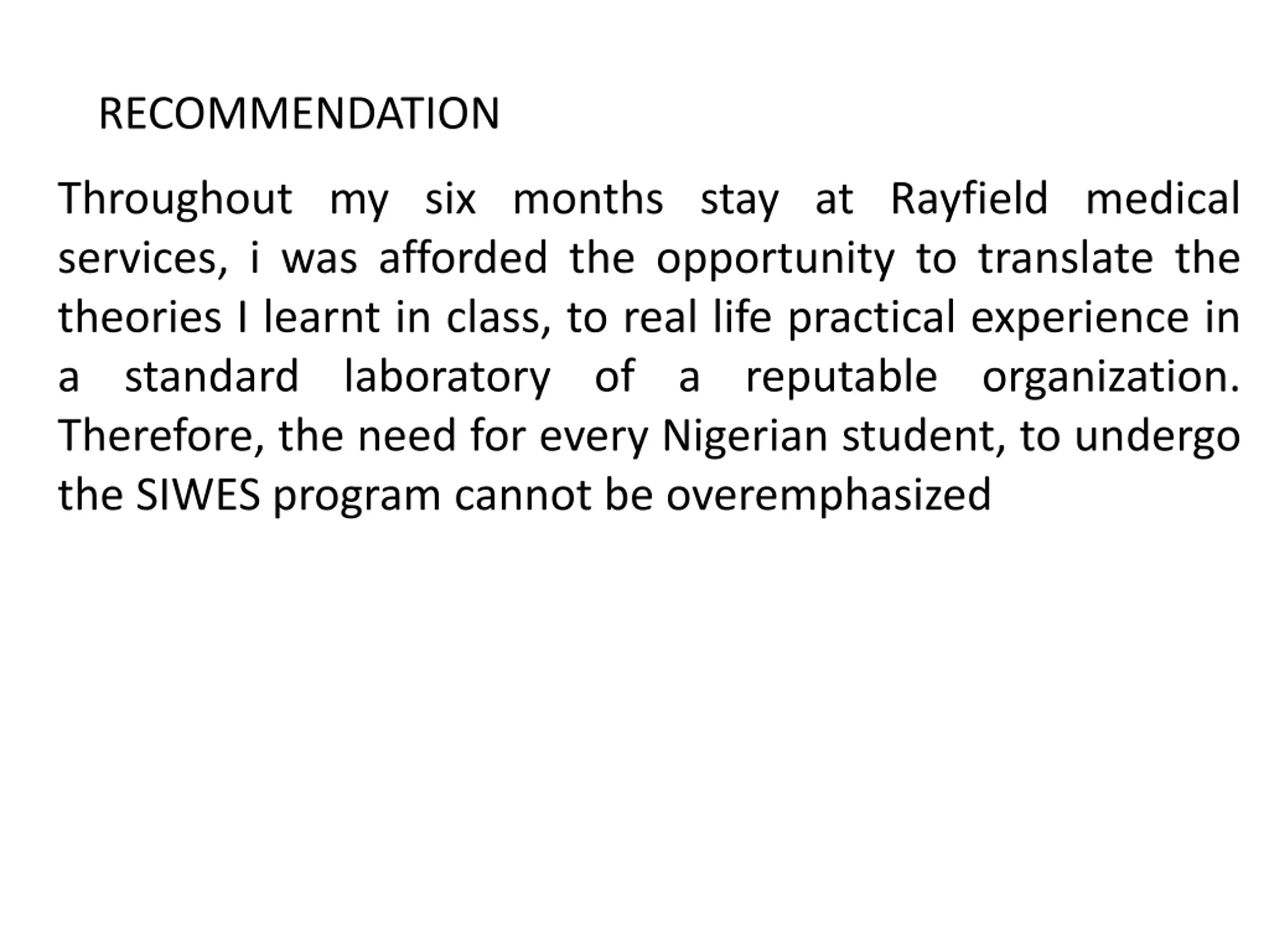 RECOMMENDATION Throughout my six months stay at Rayfield medical services, i was afforded the opportunity to translate the theories I learnt in class, to real life practical experience in a standard laboratory of a reputable organization. Therefore, the need for every Nigerian student, to undergo the SIWES program cannot be overemphasized