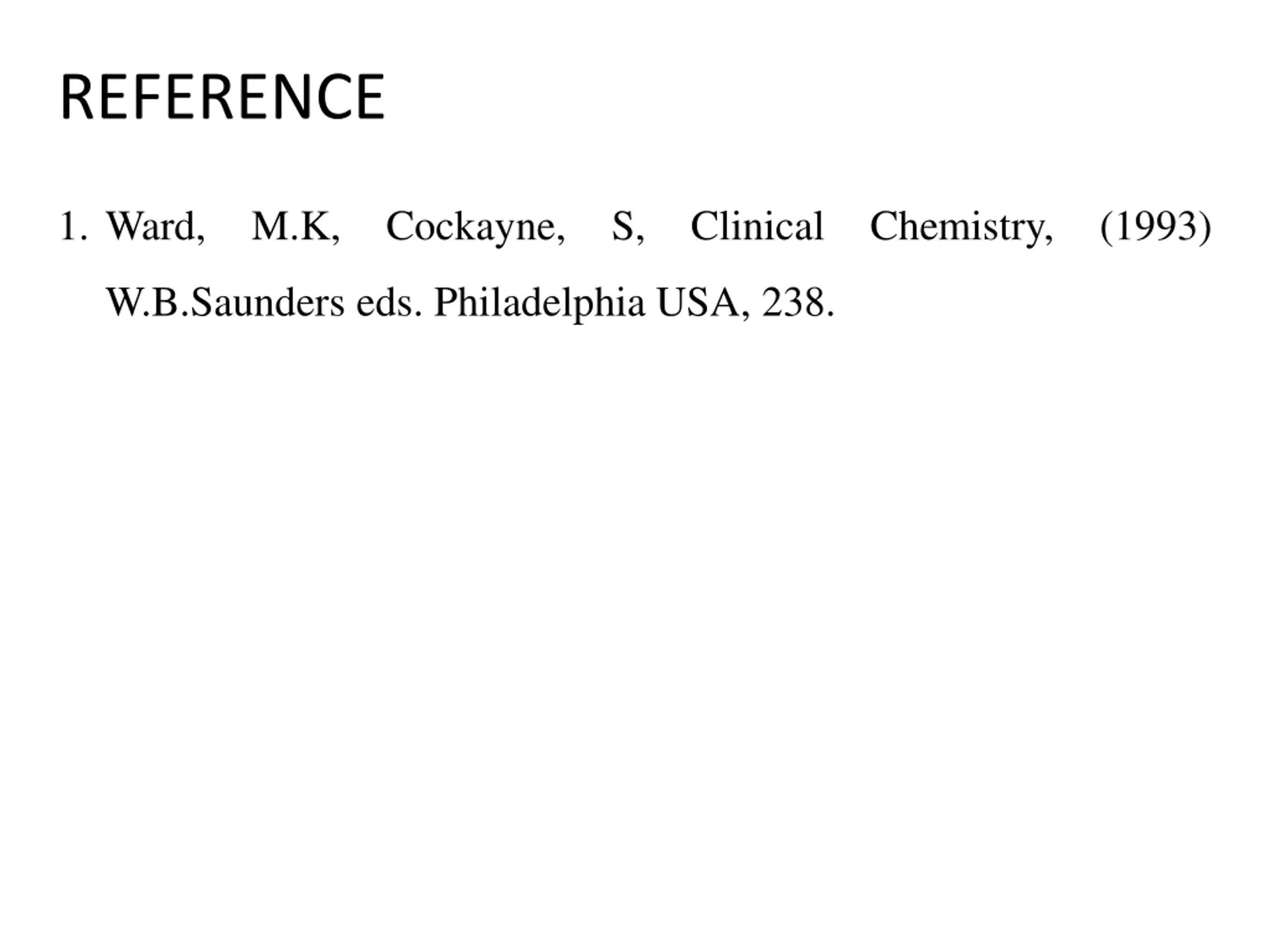 REFERENCE 1. Ward, M.K, Cockayne, S, Clinical Chemistry, (1993) W.B.Saunders eds. Philadelphia USA, 238.