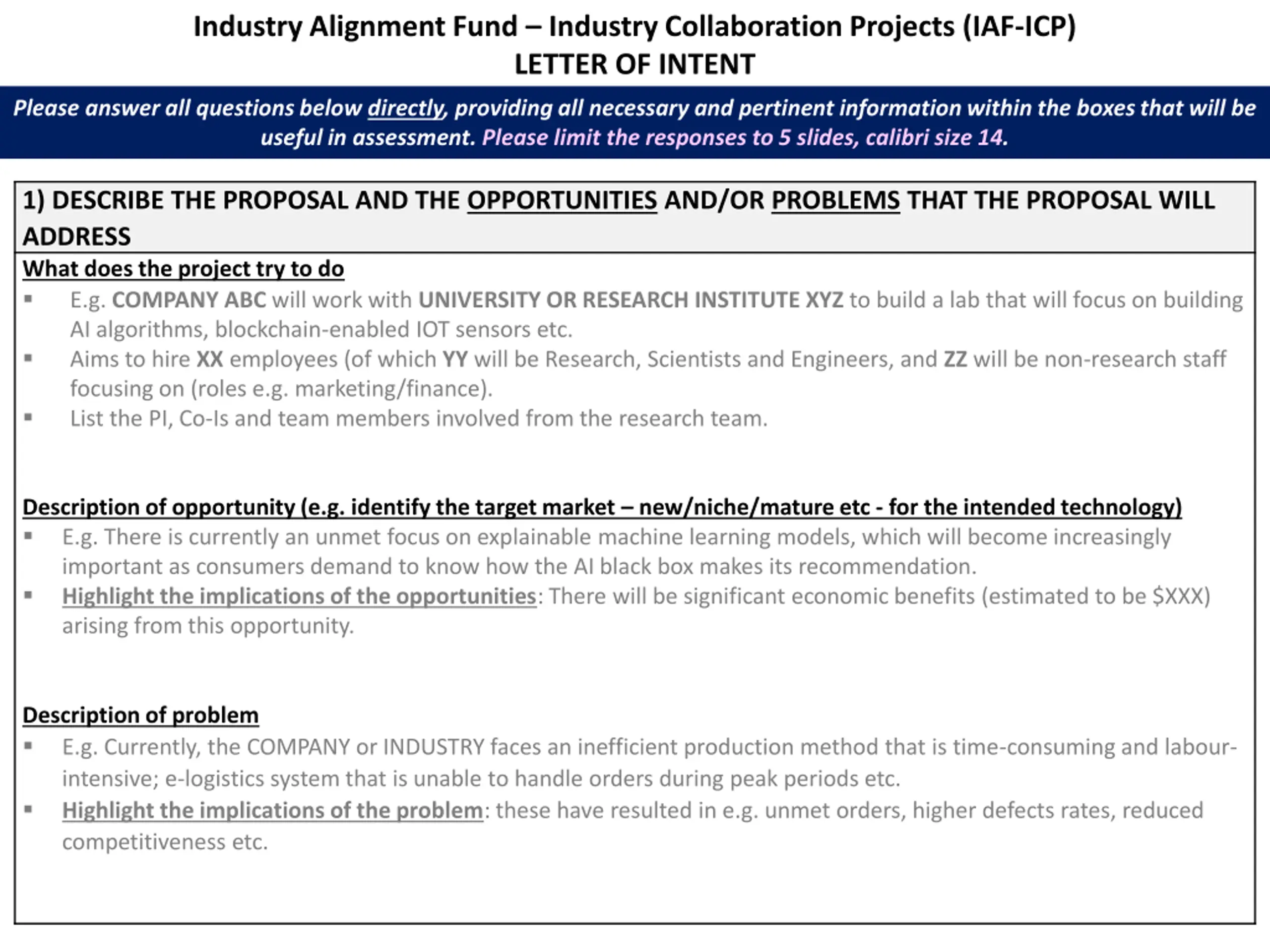 Industry Alignment Fund Industry Collaboration Projects (IAF-ICP) LETTER OF INTENT Please answer all questions below directly, providing all necessary and pertinent information within the boxes that will be useful in assessment. Please limit the responses to 5 slides, calibri size 14. Industry Partner(s) Project Title Indicate if parties have completed project plan, begun negotiation of term sheet, or are already negotiating contract terms proper. PI / Institution Co-I (s) / Institution Project Team Members Status of Negotiations XX months *: Given the intent of IAF-ICP to support strategic R&D projects with industry, by applying and commercialising public sector research capabilities, IPs and technologies towards industry-relevant challenges, the maximum duration of IAF-ICP projects should not exceed 3 years (36 months) Duration of Project* Proposed IAF Funding S$