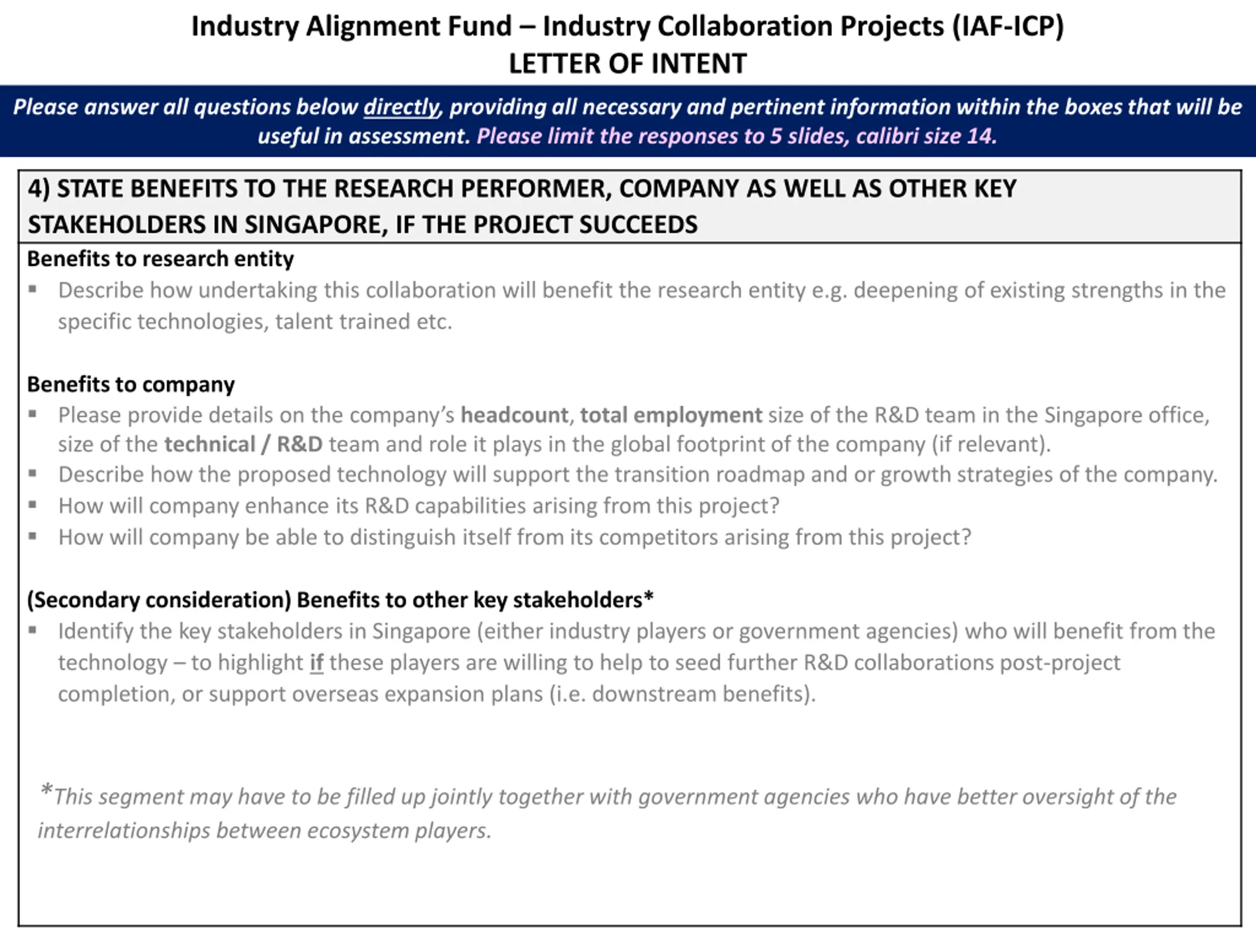 Industry Alignment Fund Industry Collaboration Projects (IAF-ICP) LETTER OF INTENT Please answer all questions below directly, providing all necessary and pertinent information within the boxes that will be useful in assessment. Please limit the responses to 5 slides, calibri size 14. 4) STATE BENEFITS TO THE RESEARCH PERFORMER, COMPANY AS WELL AS OTHER KEY STAKEHOLDERS IN SINGAPORE, IF THE PROJECT SUCCEEDS Benefits to research entity Describe how undertaking this collaboration will benefit the research entity e.g. deepening of existing strengths in the specific technologies, talent trained etc. Benefits to company Please provide details on the company s headcount, total employment size of the R&D team in the Singapore office, size of the technical / R&D team and role it plays in the global footprint of the company (if relevant). Describe how the proposed technology will support the transition roadmap and or growth strategies of the company. How will company enhance its R&D capabilities arising from this project? How will company be able to distinguish itself from its competitors arising from this project? (Secondary consideration) Benefits to other key stakeholders* Identify the key stakeholders in Singapore (either industry players or government agencies) who will benefit from the technology to highlight if these players are willing to help to seed further R&D collaborations post-project completion, or support overseas expansion plans (i.e. downstream benefits). *This segment may have to be filled up jointly together with government agencies who have better oversight of the interrelationships between ecosystem players.