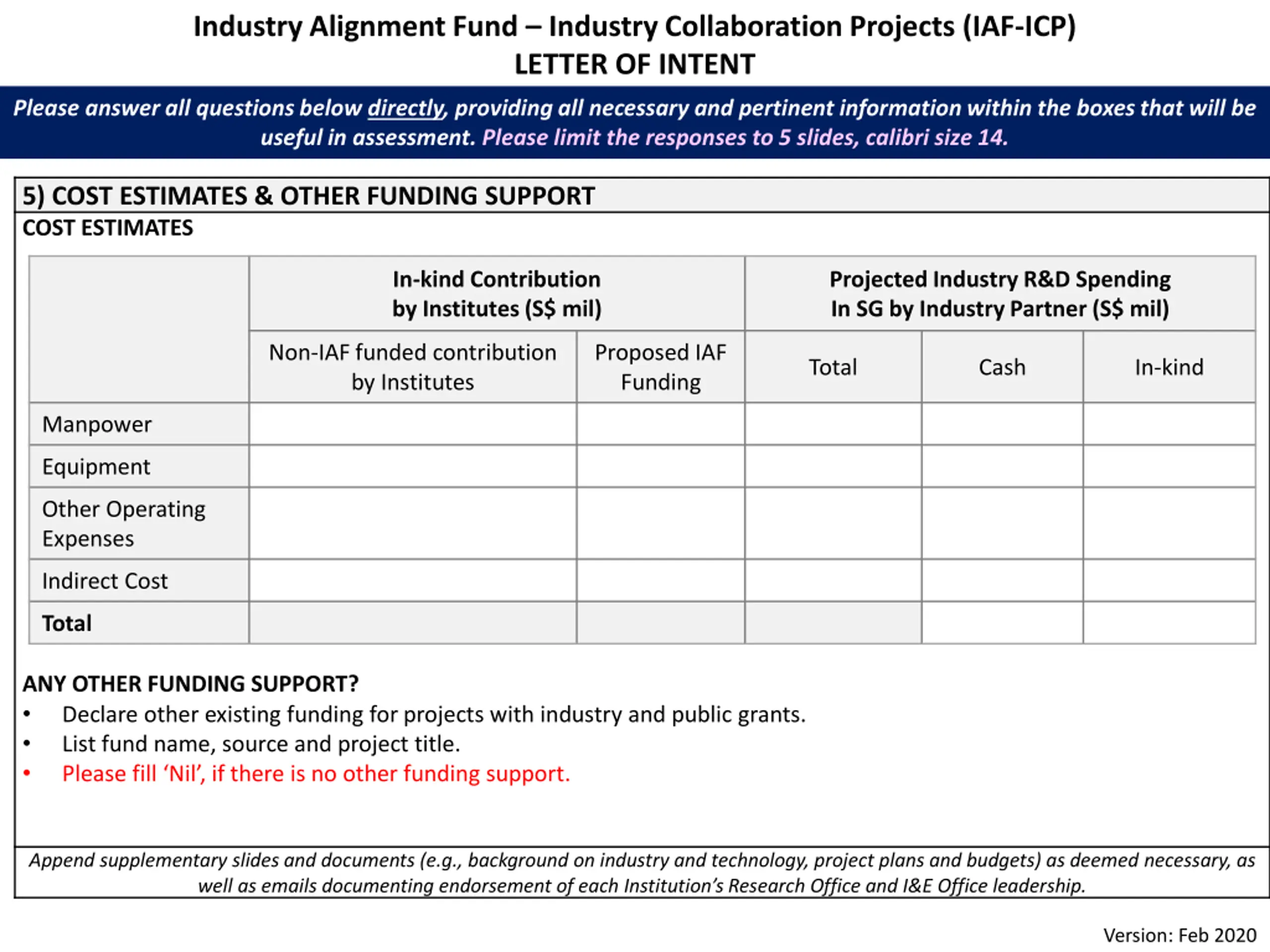 Industry Alignment Fund Industry Collaboration Projects (IAF-ICP) LETTER OF INTENT Please answer all questions below directly, providing all necessary and pertinent information within the boxes that will be useful in assessment. Please limit the responses to 5 slides, calibri size 14. 5) COST ESTIMATES & OTHER FUNDING SUPPORT COST ESTIMATES In-kind Contribution by Institutes (S$ mil) Projected Industry R&D Spending In SG by Industry Partner (S$ mil) Non-IAF funded contribution by Institutes Proposed IAF Funding Total Cash In-kind Manpower Equipment Other Operating Expenses Indirect Cost Total ANY OTHER FUNDING SUPPORT? Declare other existing funding for projects with industry and public grants. List fund name, source and project title. Please fill Nil , if there is no other funding support. Append supplementary slides and documents (e.g., background on industry and technology, project plans and budgets) as deemed necessary, as well as emails documenting endorsement of each Institution s Research Office and I&E Office leadership. Version: Feb 2020