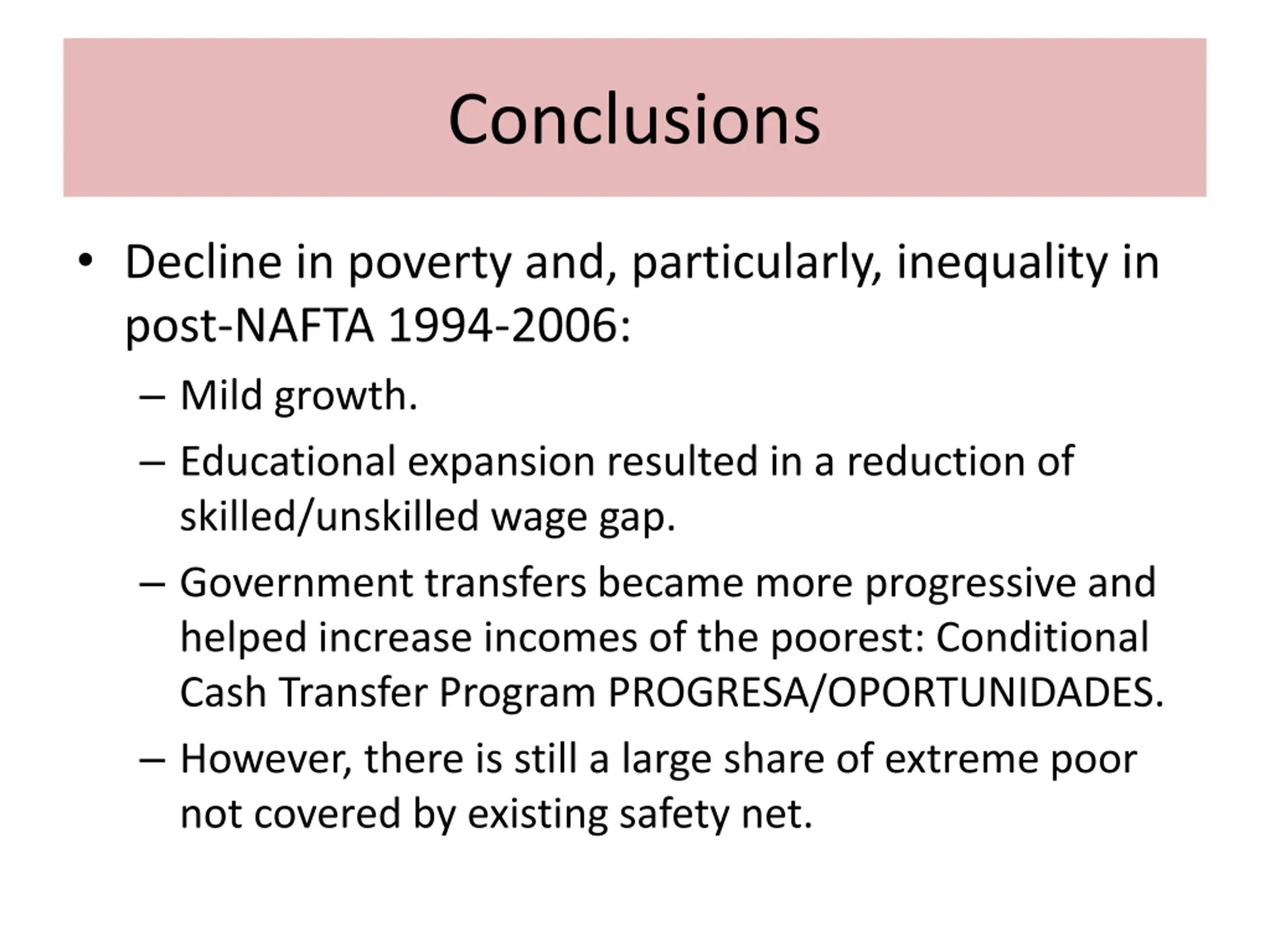 Conclusions Decline in poverty and, particularly, inequality in post-NAFTA 1994-2006: Mild growth. Educational expansion resulted in a reduction of skilled/unskilled wage gap. Government transfers became more progressive and helped increase incomes of the poorest: Conditional Cash Transfer Program PROGRESA/OPORTUNIDADES. However, there is still a large share of extreme poor not covered by existing safety net.