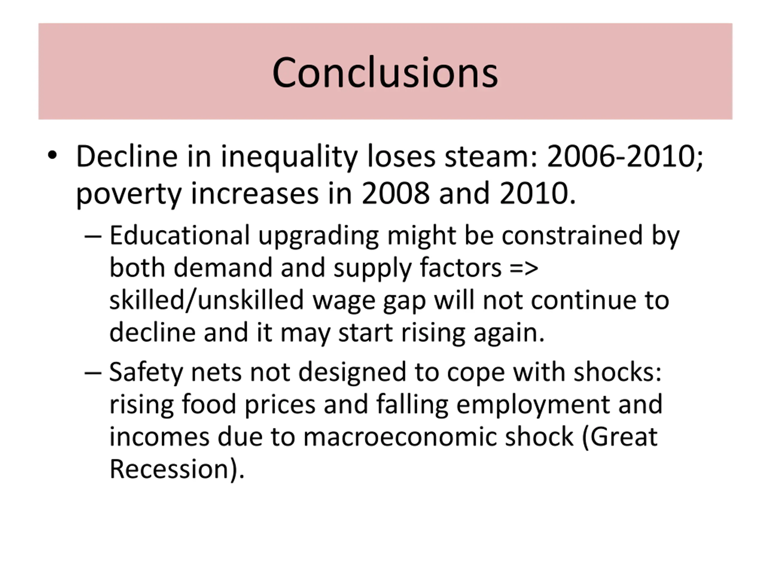 Conclusions Decline in inequality loses steam: 2006-2010; poverty increases in 2008 and 2010. Educational upgrading might be constrained by both demand and supply factors => skilled/unskilled wage gap will not continue to decline and it may start rising again. Safety nets not designed to cope with shocks: rising food prices and falling employment and incomes due to macroeconomic shock (Great Recession).
