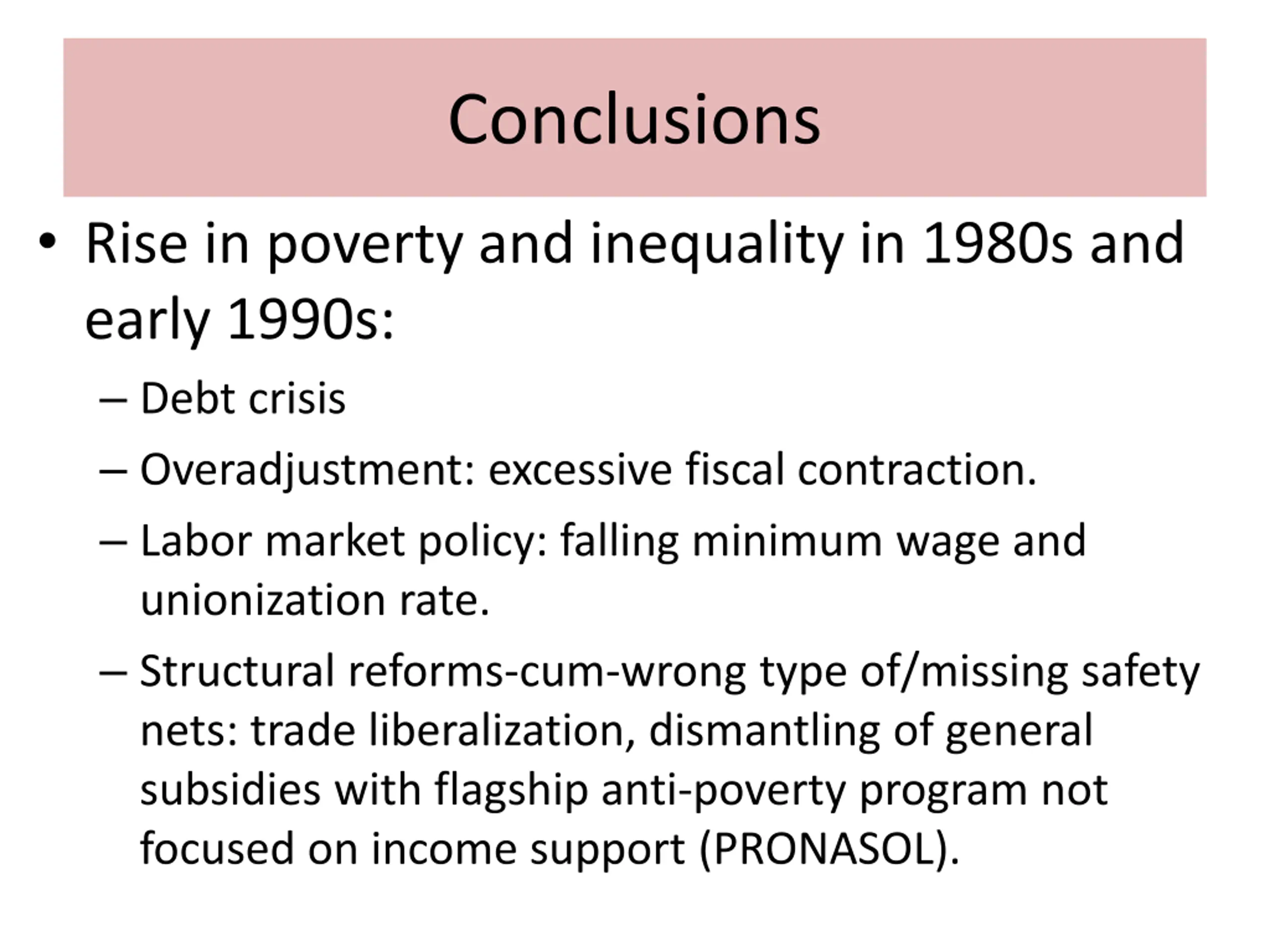 Conclusions Rise in poverty and inequality in 1980s and early 1990s: Debt crisis Overadjustment: excessive fiscal contraction. Labor market policy: falling minimum wage and unionization rate. Structural reforms-cum-wrong type of/missing safety nets: trade liberalization, dismantling of general subsidies with flagship anti-poverty program not focused on income support (PRONASOL).