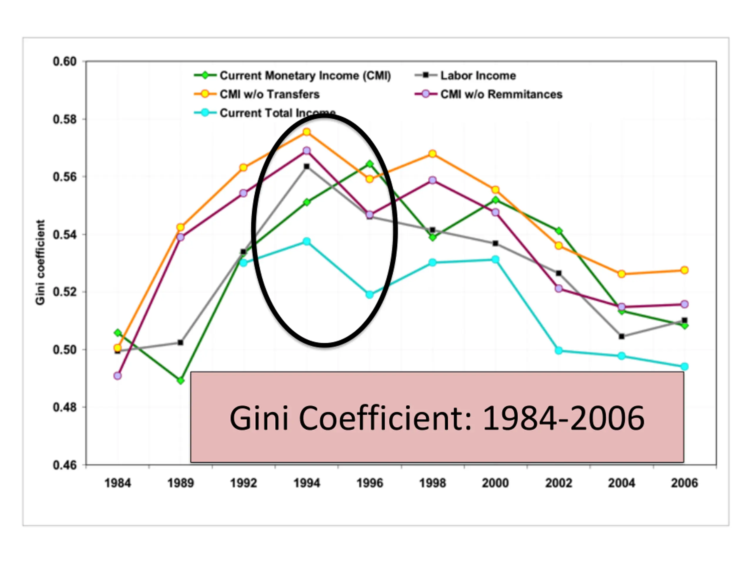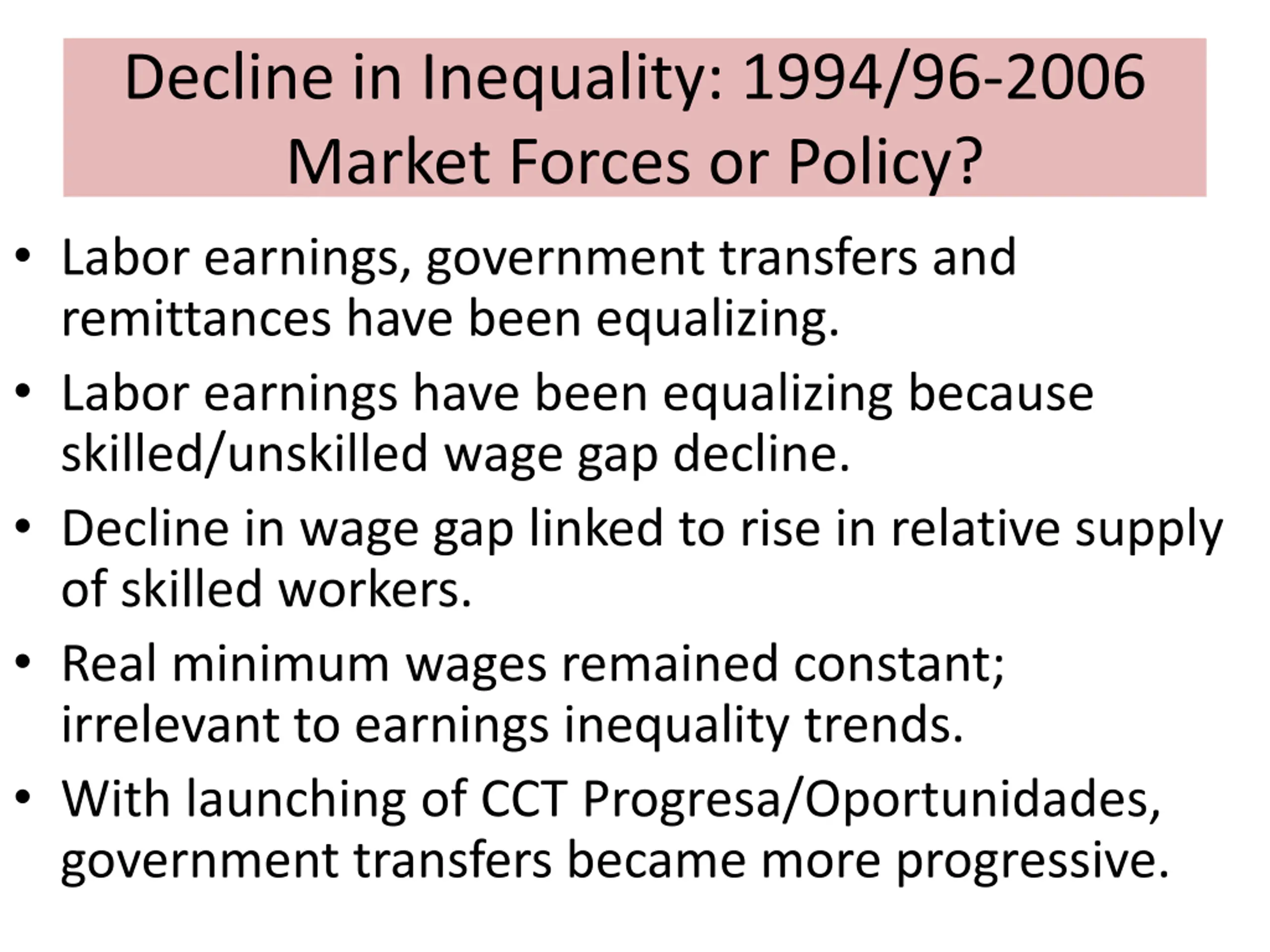 Decline in Inequality: 1994/96-2006 Market Forces or Policy? Labor earnings, government transfers and remittances have been equalizing. Labor earnings have been equalizing because skilled/unskilled wage gap decline. Decline in wage gap linked to rise in relative supply of skilled workers. Real minimum wages remained constant; irrelevant to earnings inequality trends. With launching of CCT Progresa/Oportunidades, government transfers became more progressive.
