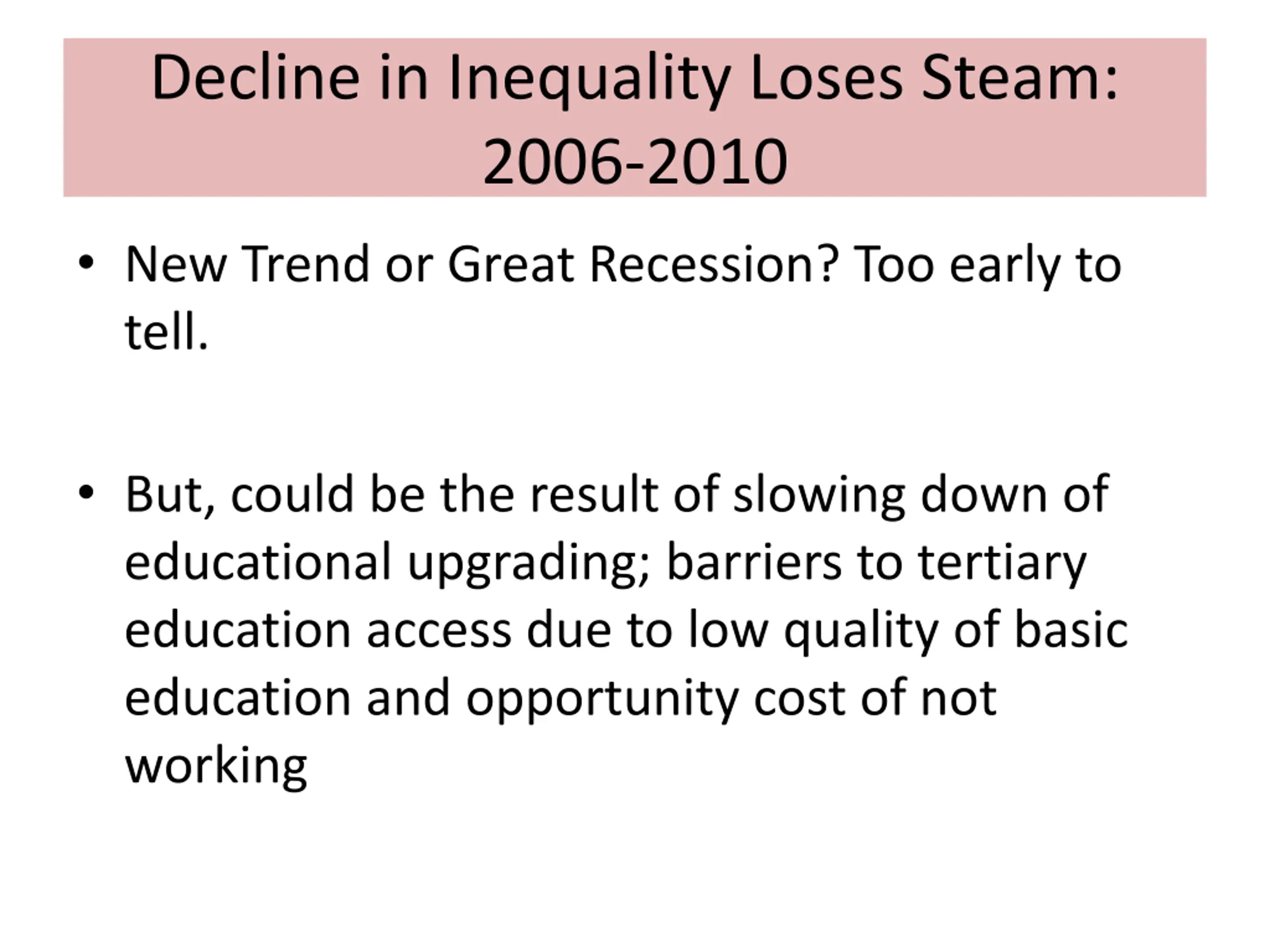 Decline in Inequality Loses Steam: 2006-2010 New Trend or Great Recession? Too early to tell. But, could be the result of slowing down of educational upgrading; barriers to tertiary education access due to low quality of basic education and opportunity cost of not working