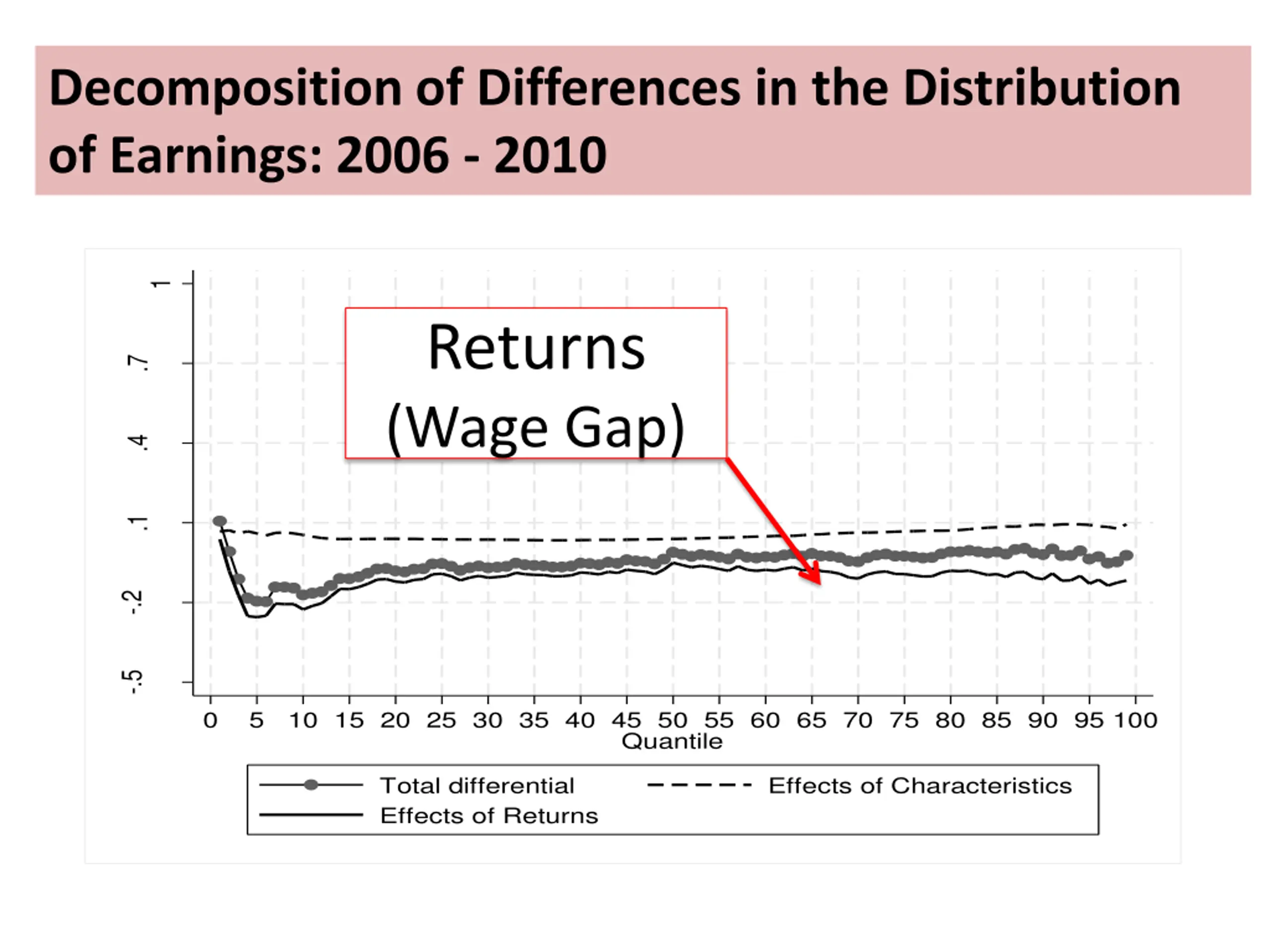 Decomposition of Differences in the Distribution of Earnings: 2006 - 2010 1 Returns (Wage Gap) .7 Log wage effects .4 .1 -.2 -.5 0 5 10 15 20 25 30 35 40 45 50 55 60 65 70 75 80 85 90 95 100 Quantile Total differential Effects of Returns Effects of Characteristics