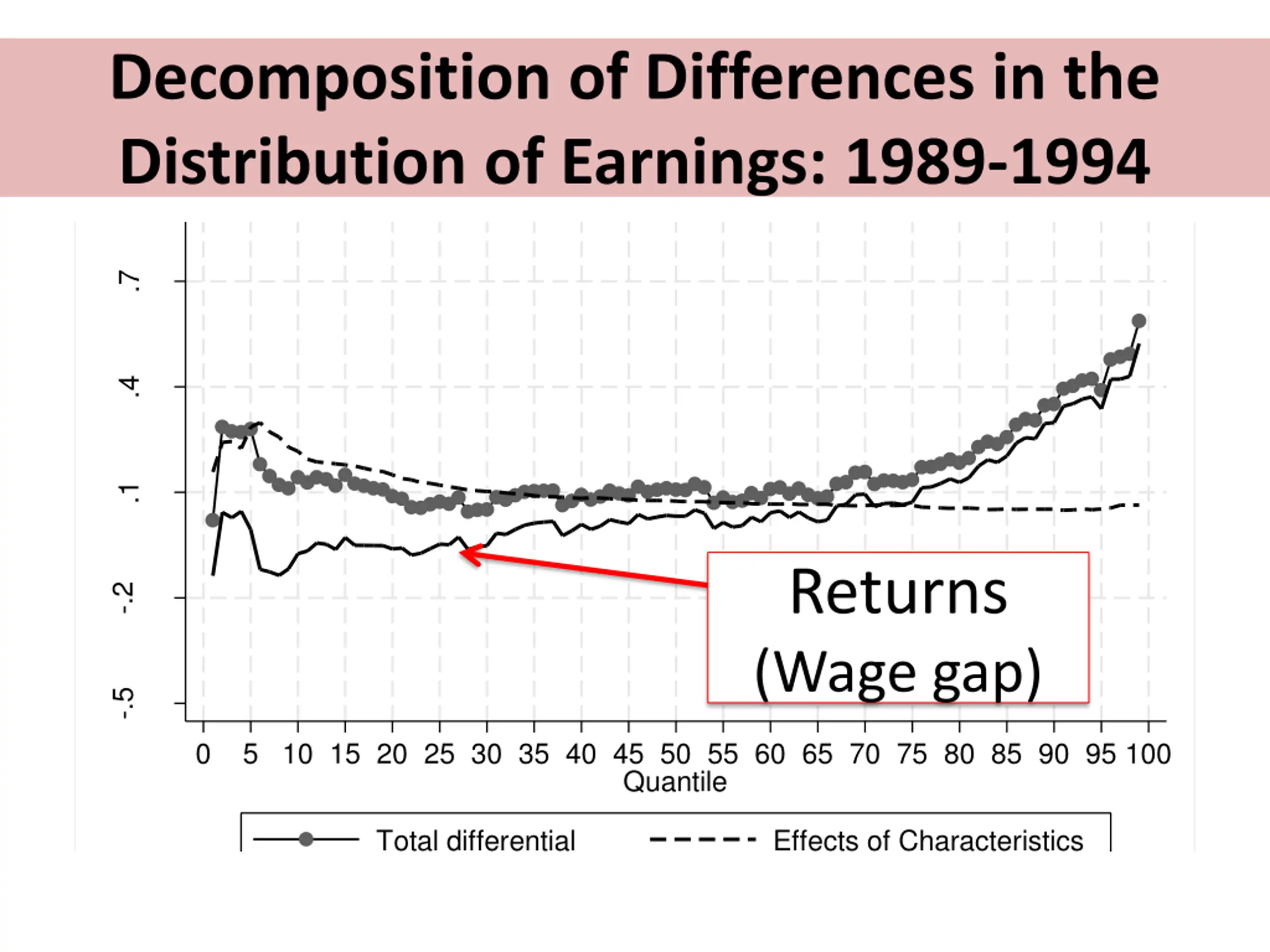 Decomposition of Differences in the Distribution of Earnings: 1989-1994 1 .7 Log wage effects .4 .1 Returns (Wage gap) -.2 -.5 0 5 10 15 20 25 30 35 40 45 50 55 60 65 70 75 80 85 90 95 100 Quantile Total differential Effects of Returns Effects of Characteristics
