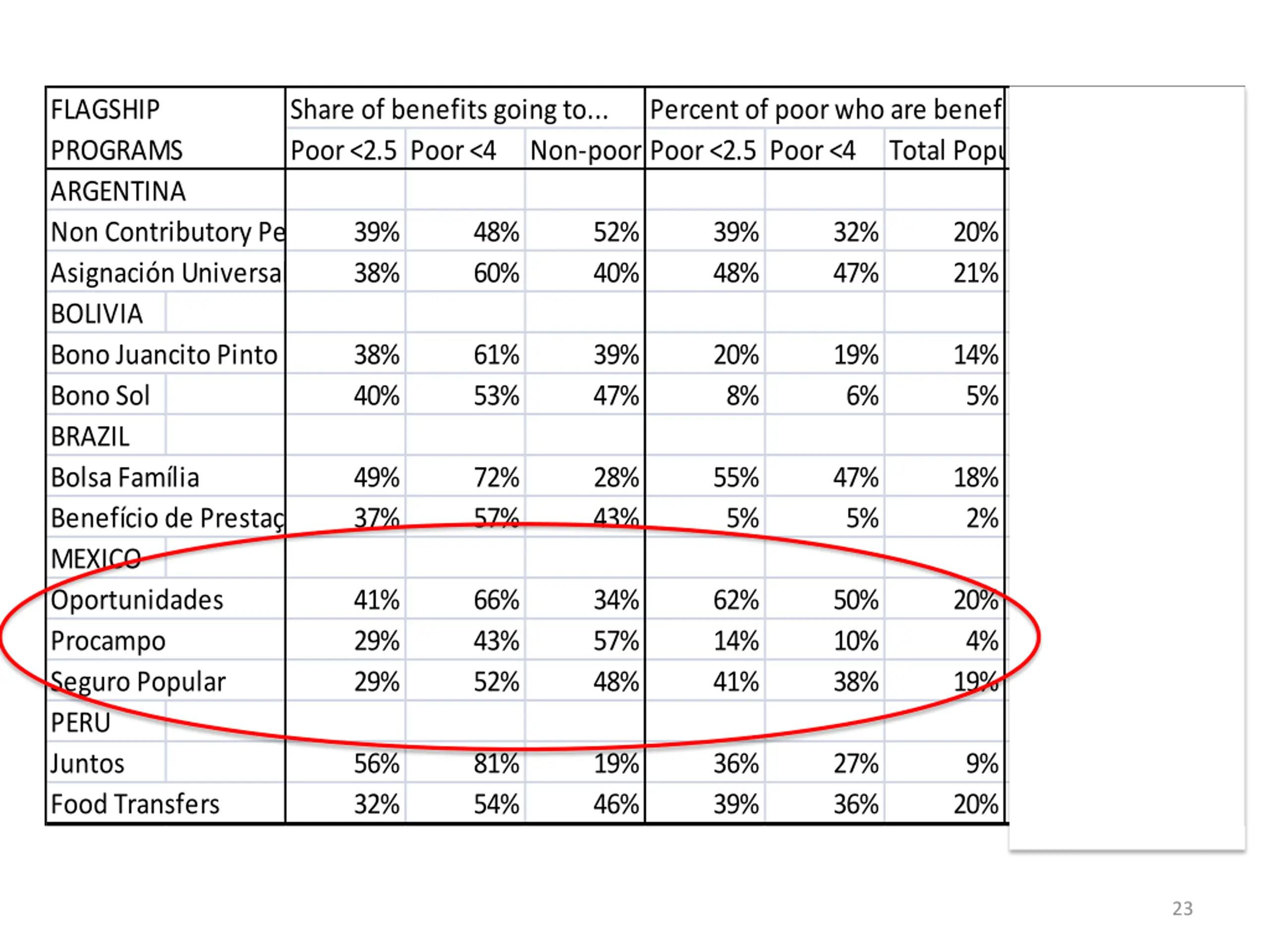FLAGSHIP PROGRAMS Share of benefits going to... Poor <2.5 Poor <4 Percent of poor who are beneficiaries Non-poor Poor <2.5 Poor <4 Percent of CEQ Social Spending Total Population GDP ARGENTINA Non Contributory Pensions 39% Asignaci n Universal Por Hijo (simulated) BOLIVIA Bono Juancito Pinto Bono Sol BRAZIL Bolsa Fam lia Benef cio de Presta o Continuada (BPC)a MEXICO Oportunidades Procampo 48% 60% 52% 40% 39% 48% 32% 47% 20% 21% 15% 3% 2% 0% 38% 38% 40% 61% 53% 39% 47% 20% 8% 19% 6% 14% 5% 2% 6% 0% 1% 49% 37% 72% 57% 28% 43% 55% 5% 47% 5% 18% 2% 2% 3% 0% 1% 41% 29% 29% 66% 43% 52% 34% 57% 48% 62% 14% 41% 50% 10% 38% 20% 4% 19% 4% 1% 4% 0% 0% 0% Seguro Popular PERU Juntos Food Transfers 56% 32% 81% 54% 19% 46% 36% 39% 27% 36% 9% 20% 3% 5% 0% 0% 23
