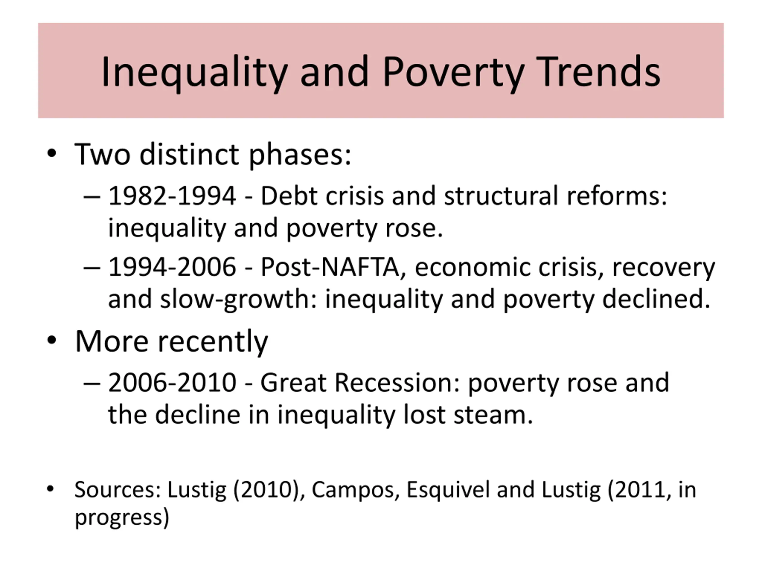 Inequality and Poverty Trends Two distinct phases: 1982-1994 - Debt crisis and structural reforms: inequality and poverty rose. 1994-2006 - Post-NAFTA, economic crisis, recovery and slow-growth: inequality and poverty declined. More recently 2006-2010 - Great Recession: poverty rose and the decline in inequality lost steam. Sources: Lustig (2010), Campos, Esquivel and Lustig (2011, in progress)